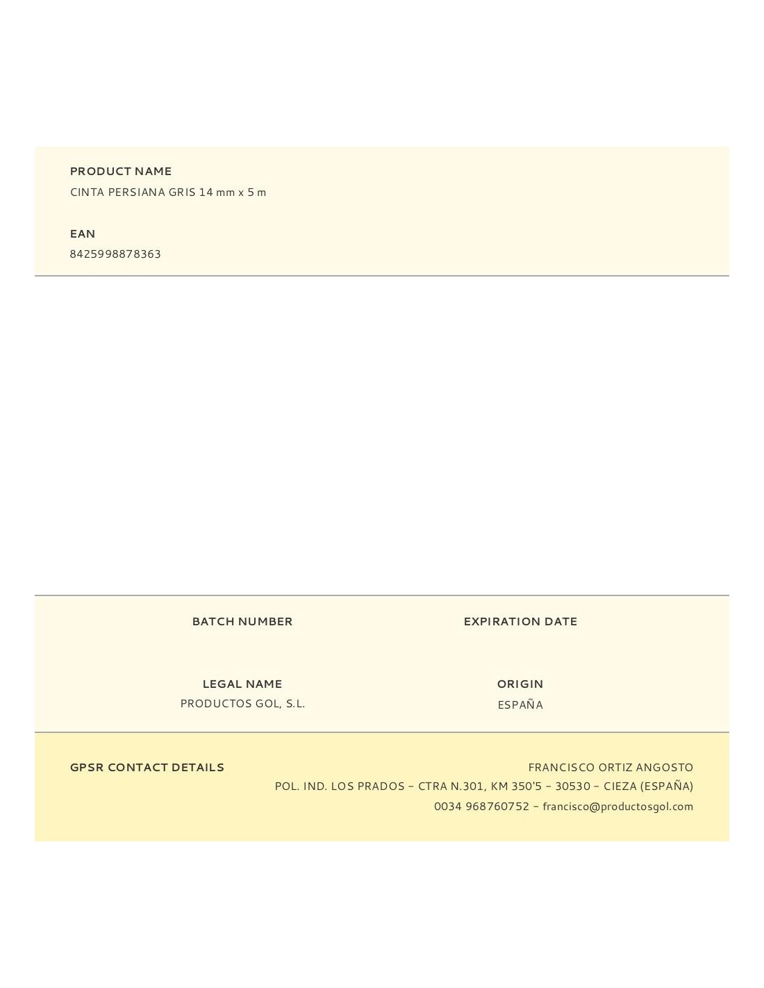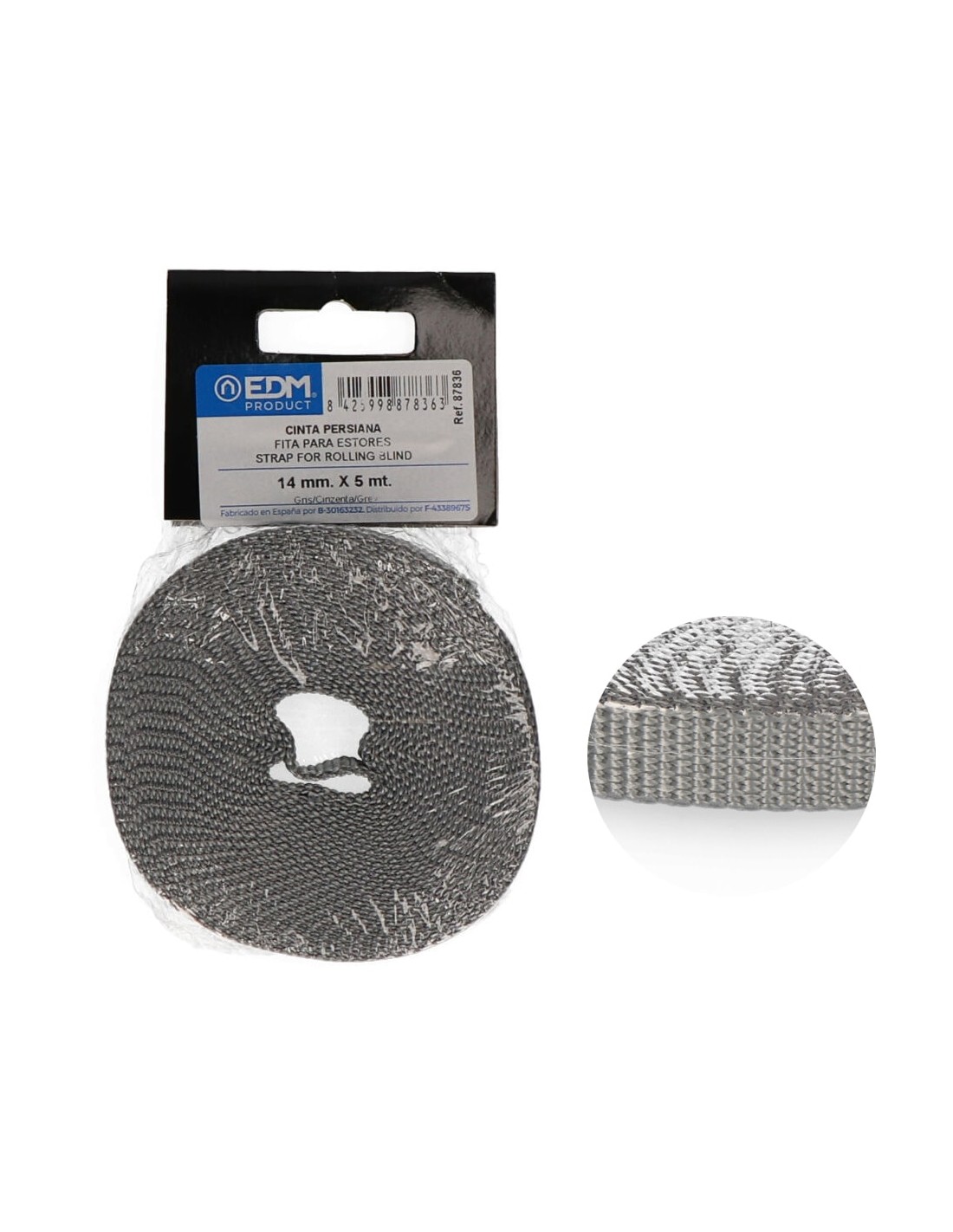 Cinta persiana mini gris, tejidas con hilo de polipropileno 100%. caracteristicas: flexible, buena resistencia al roce, suave al tacto, facil limpieza. 14 mm x 5 m