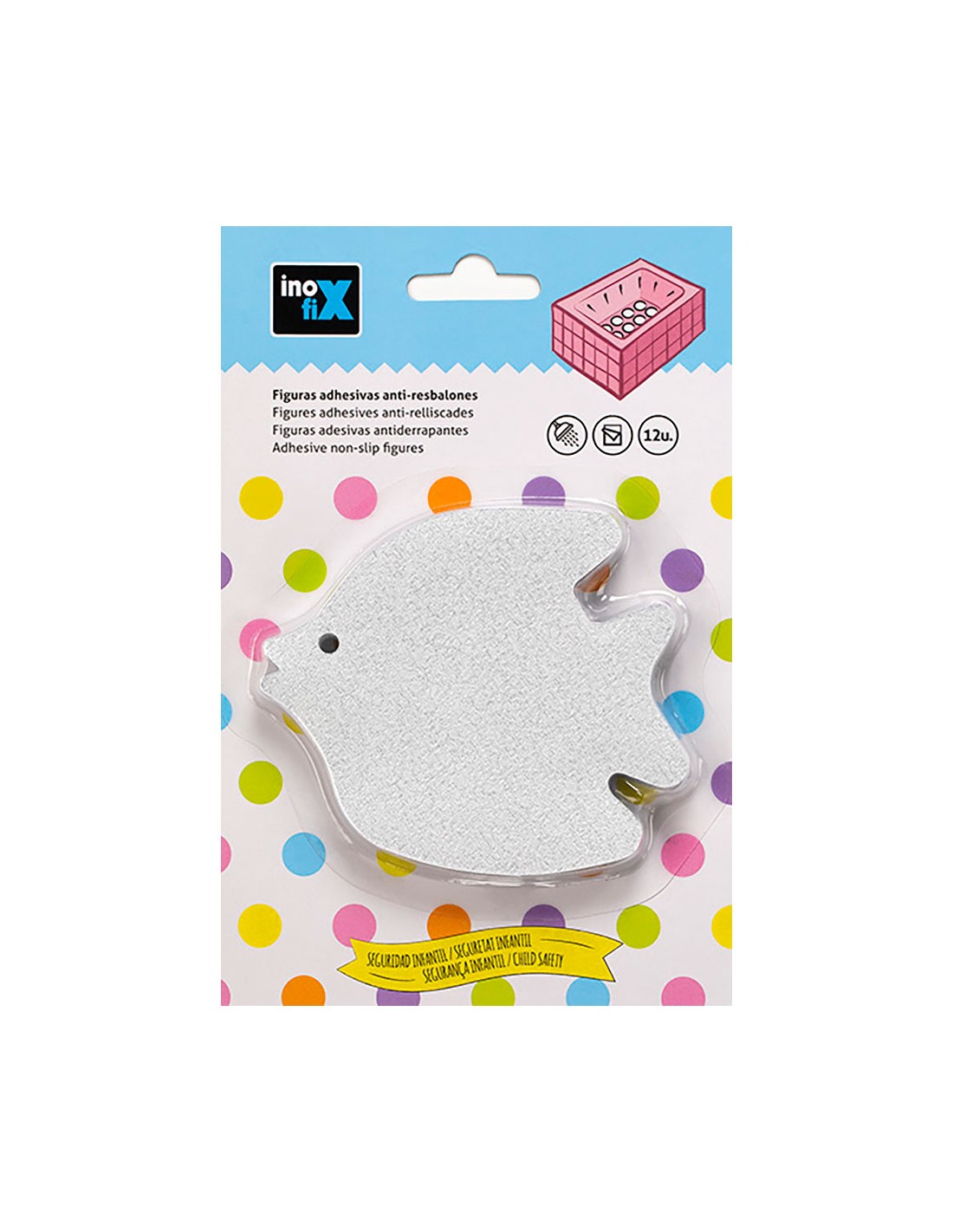 Figuras adhesivas anti-resbalones forma pez 5302-0 (blister 12 unid.) inofix. transparentes ideales para aplicarlas en platos de duchas y bañeras y superficies mojadas o húmedas. adhesivo acrílico de alta resistencia.1x104x88mm.