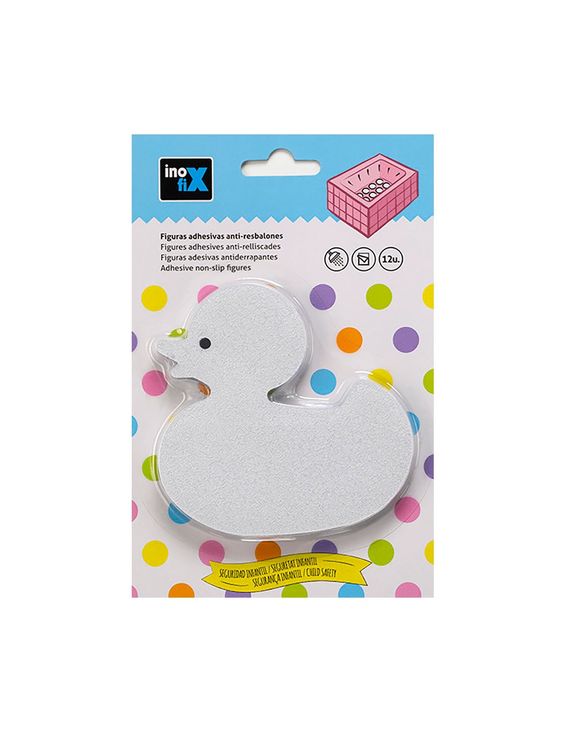 Figuras adhesivas anti-resbalones forma pato (blister 12 unid.) inofix. transparentes ideales para aplicarlas en platos de duchas y bañeras y superficies mojadas o húmedas.adhesivo acrílico de alta resistencia.1x101x100mm.