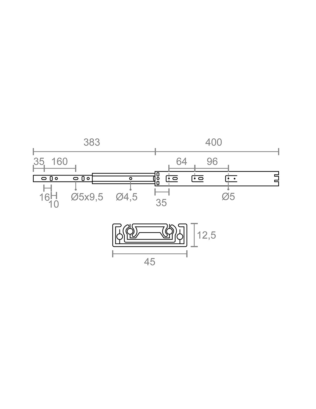 Juego de guia telescópica de cajón en acero 400mm. dimensiones: 45x12,5mm (ancho/alto). de extracción total con sistema de freno mediante amortiguador especial de goma. montaje del cajón mediante tornillos. carga máxima de 45kg. dispone de gatillo lateral para desmontaje. incluye codigo de barras individual. acabado zincado. micel
