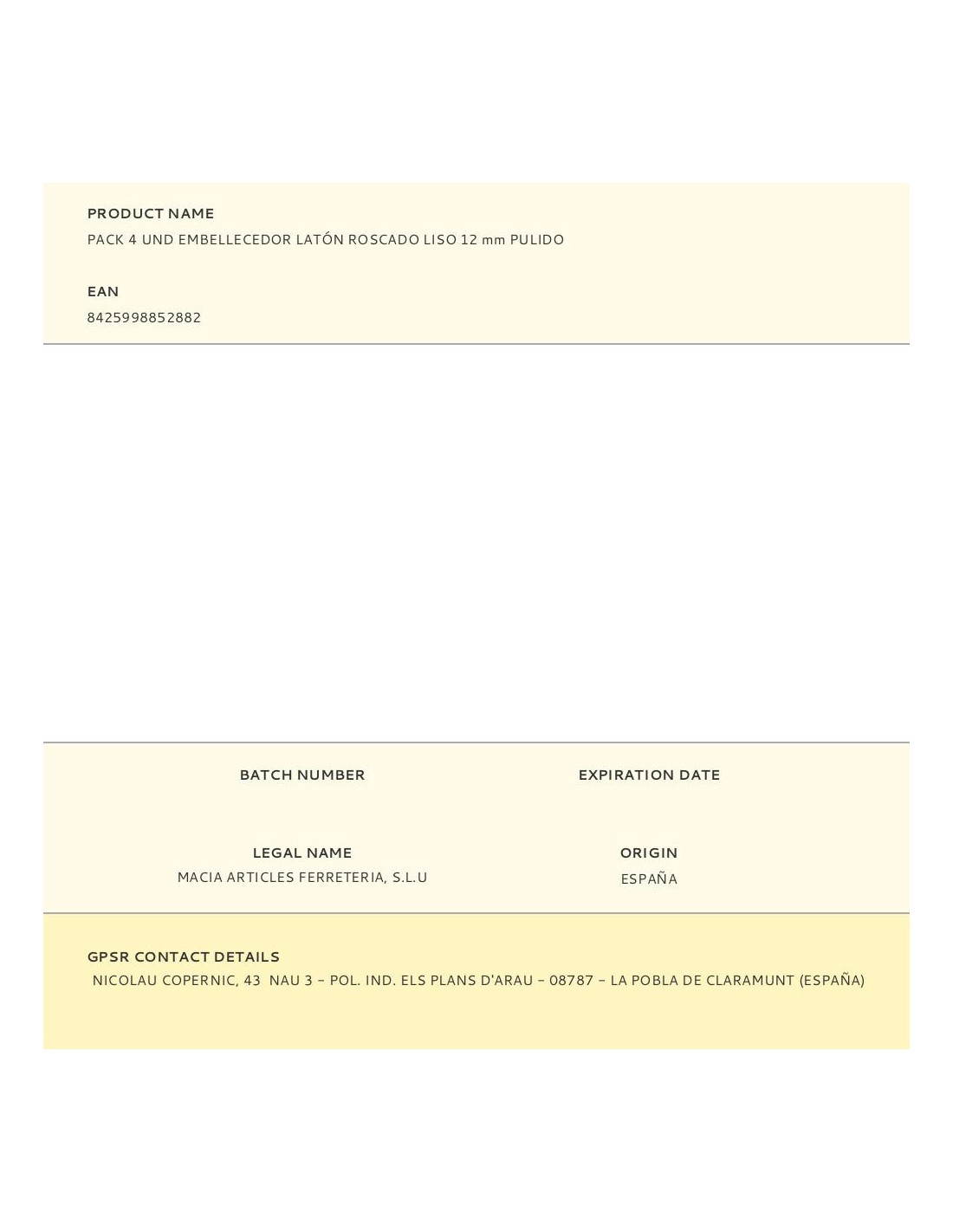 Embellecedor latón roscado liso 12 mm pulido, 4 uds
