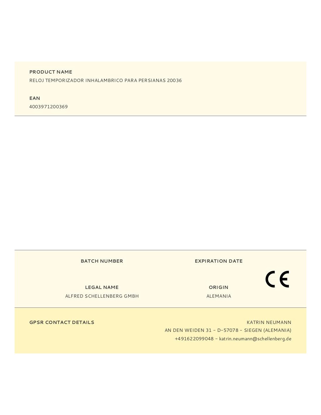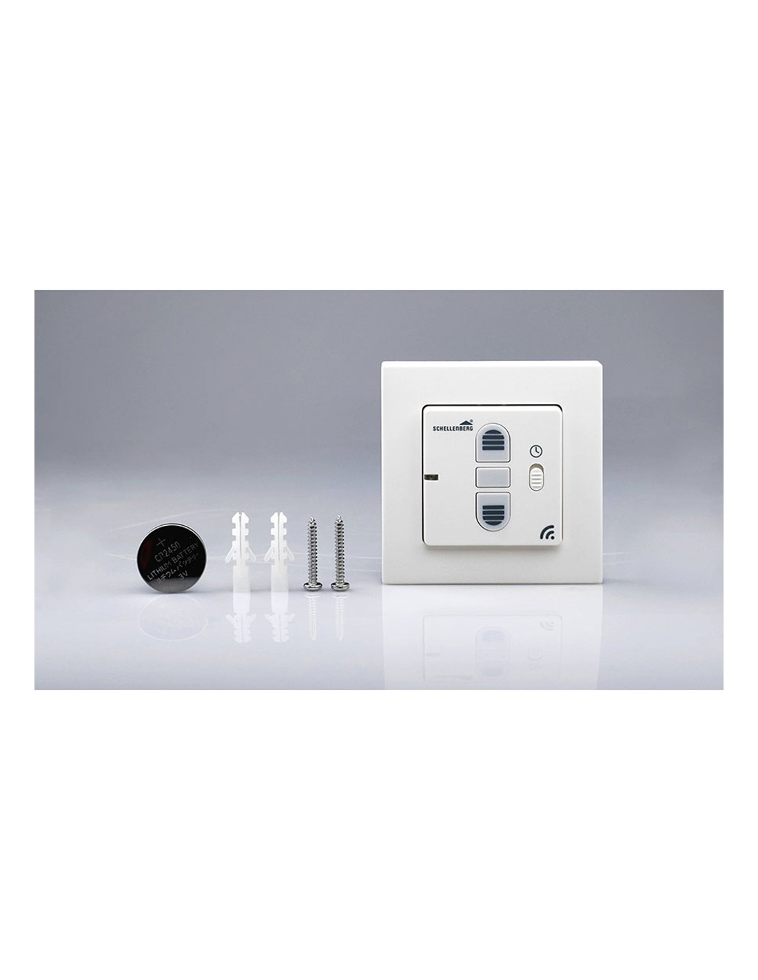 Reloj temporizador inhalambrico para persianas 20036 schellenberg. temporizador, control remoto e interruptor de pared en un solo dispositivo. usos versátiles para persianas y toldos inalámbricos control de hasta 5 unidades inalámbricas a la vez. control automático de persianas y toldos con el temporizador conveniente (un horario de apertura y cierre para cada día de la semana programable). soporte de marco incluid. baterías de 3 voltios incluidas (litio, cr 2450).