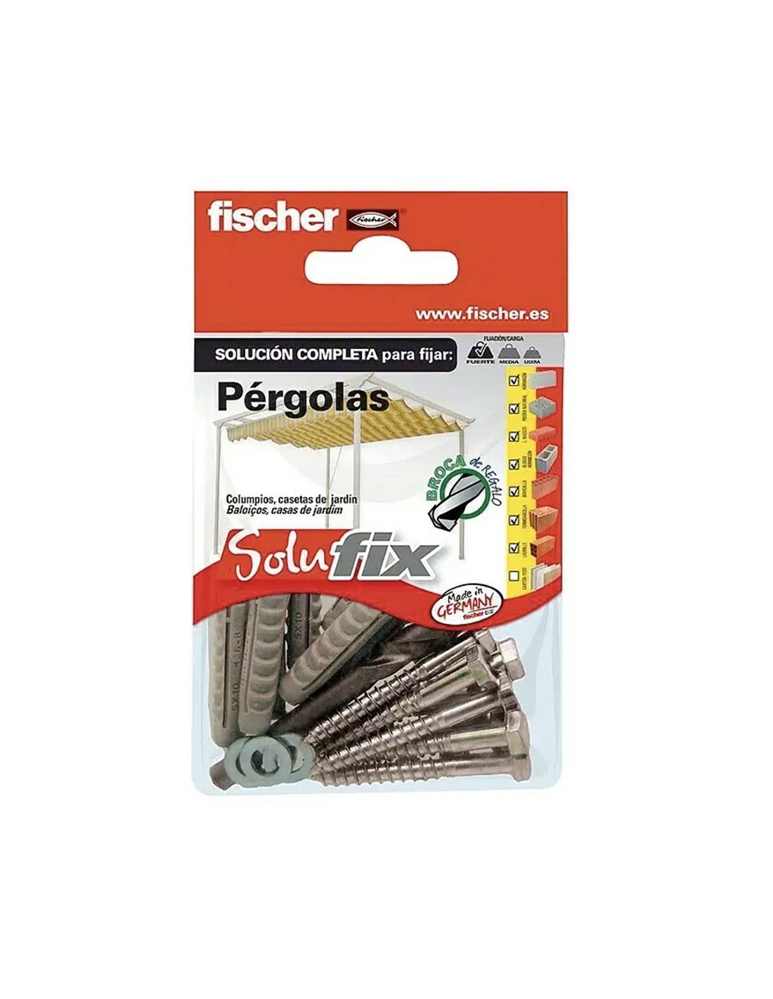 Kit fijación pergolas 568680 solufix fischer kit de fijación solufix enfocado al montaje de pérgolas, columpios, casetas de jardín, etc. incluye 8 tacos sx 10x50mm, 8 tornillos inoxidables de cabeza avellanada 7x60mm, 8 arandelas inoxidables m8 y 1 broca número 10.