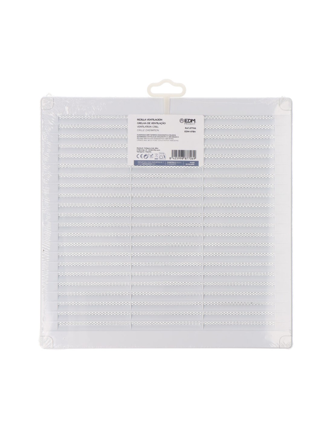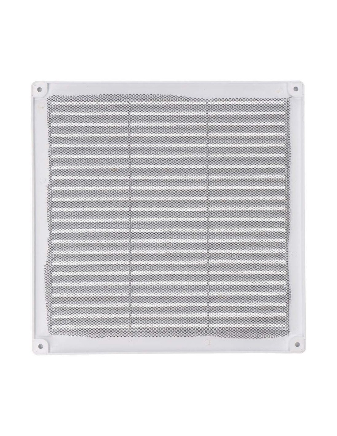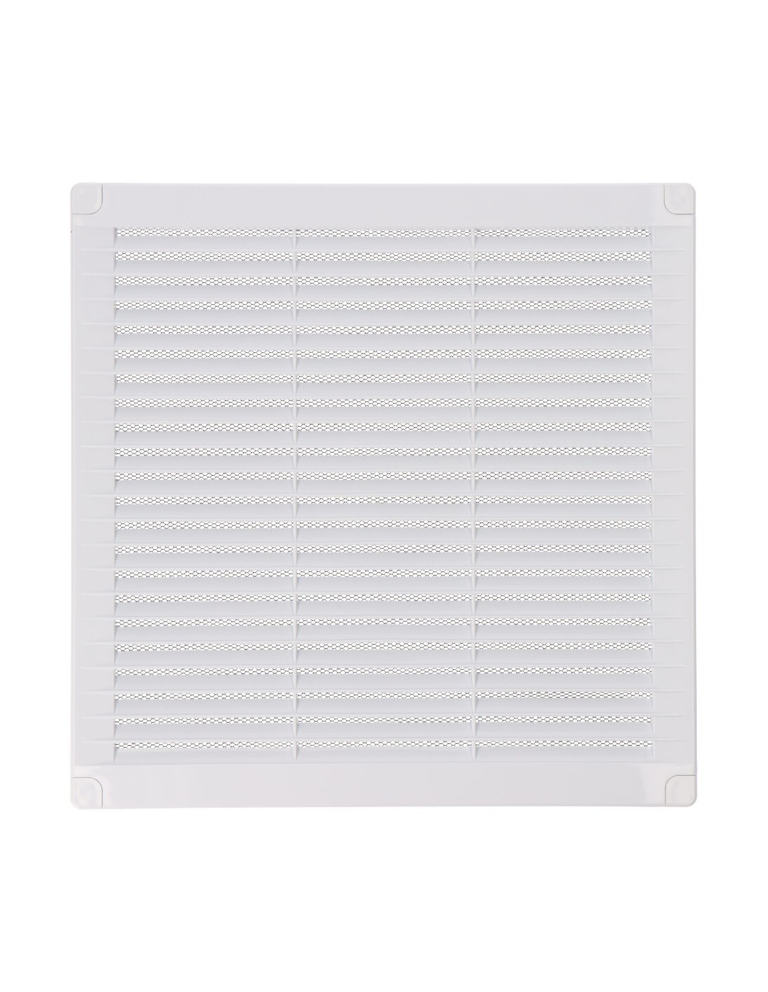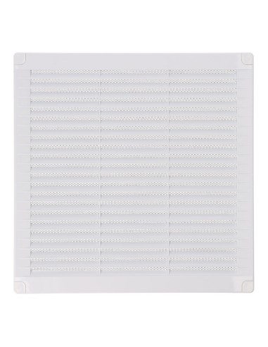 Rejilla ventilación cuadrada de plástico con tapones y mosquitera, medida 250x250x7mm blanca