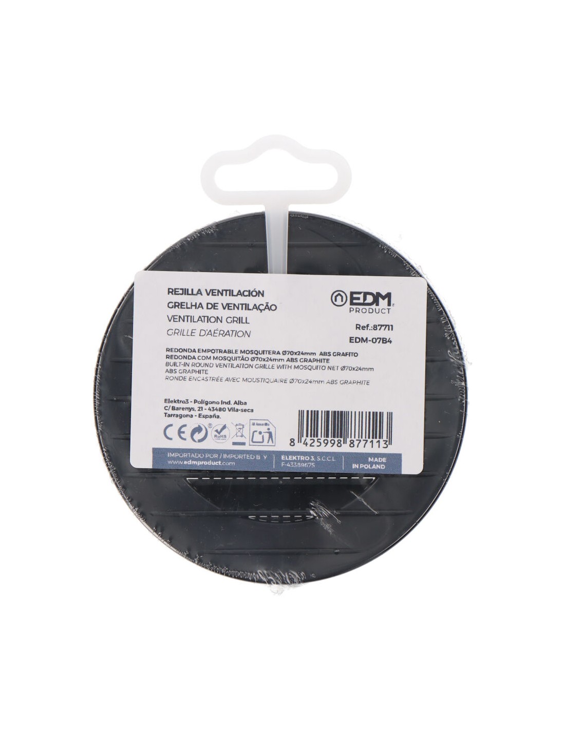 Rejilla ventilación redonda empotrable con mosquitera de plástico, medida enclavamiento ø70mm, medida ø 98x5mm gris antracita