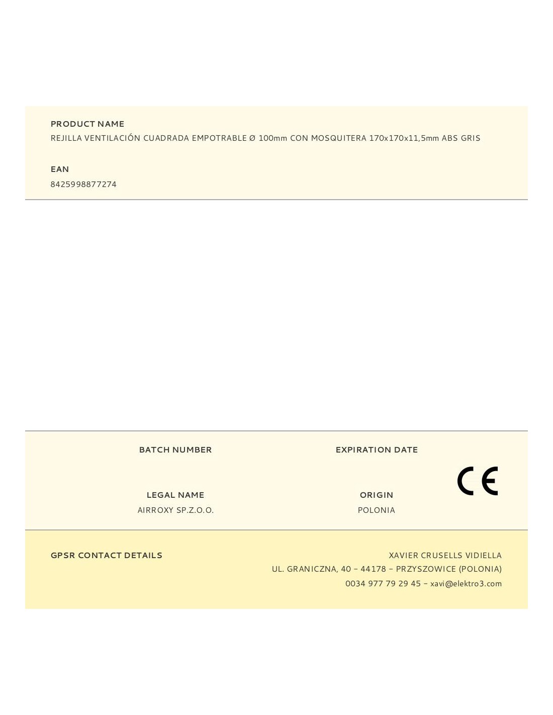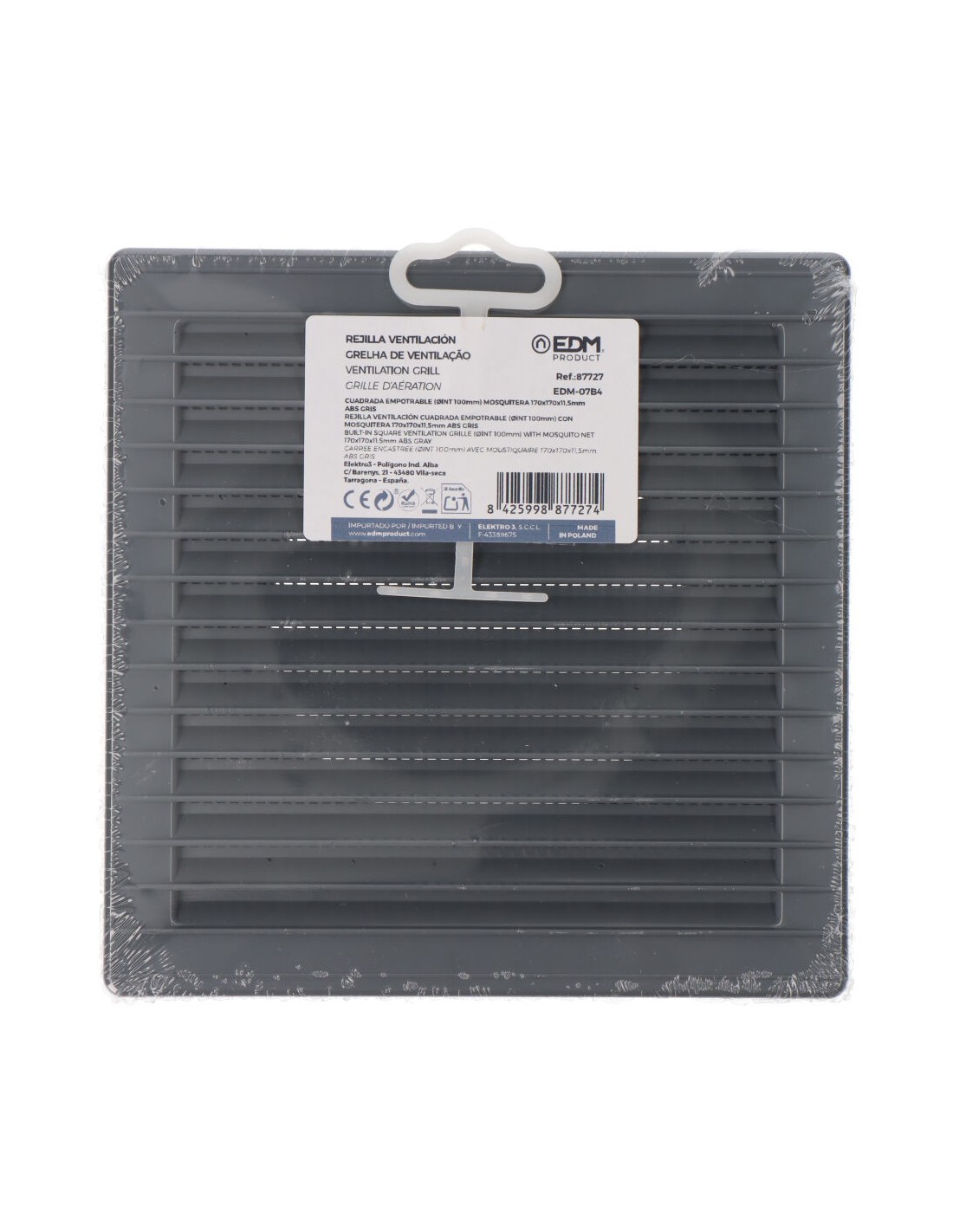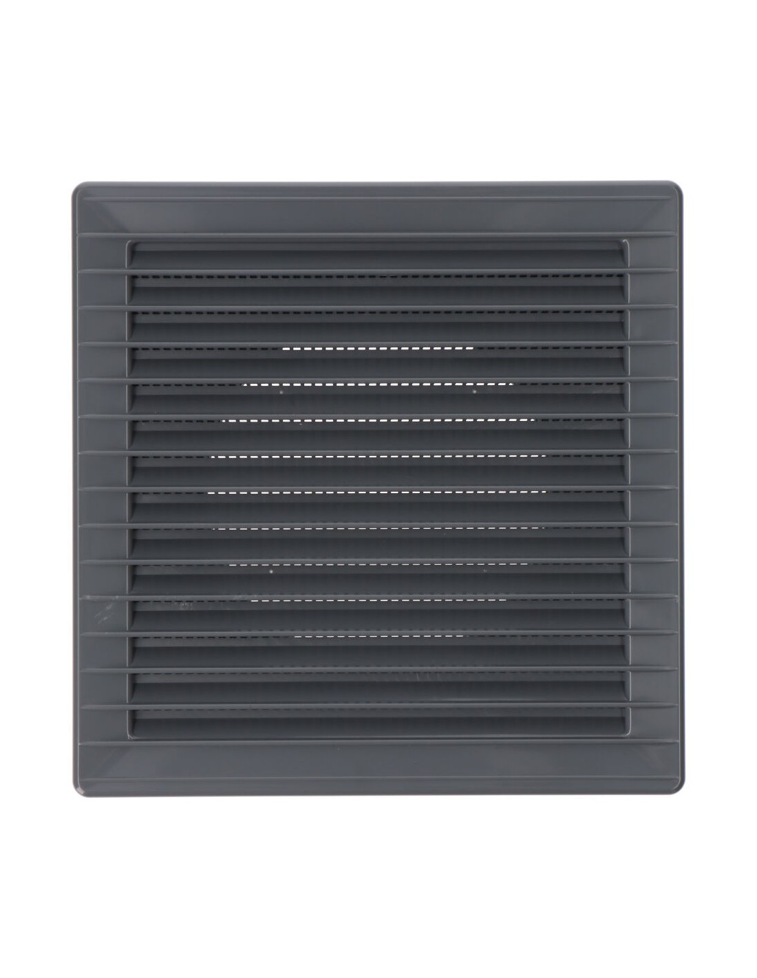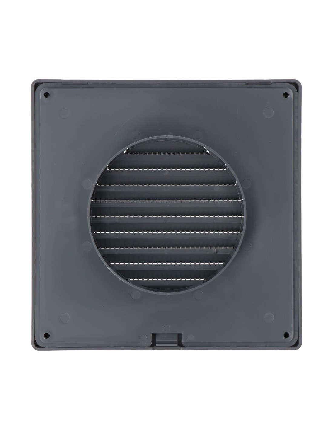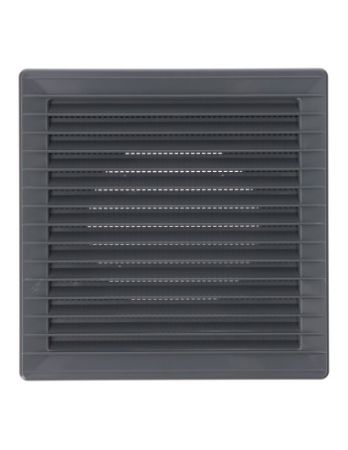 Rejilla ventilación cuadrada empotrable de plástico con mosquitera , medida enclavamiento ø 100mm medida170x170x11,5mm gris