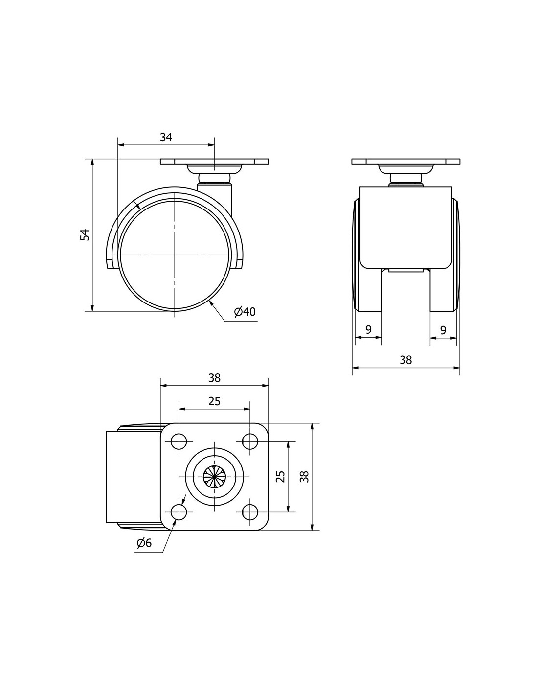 Rueda giratoria con placa y eje liso, color negro, material: polipropileno- plástico, carga máxima de 20 kg, ø 4 cm