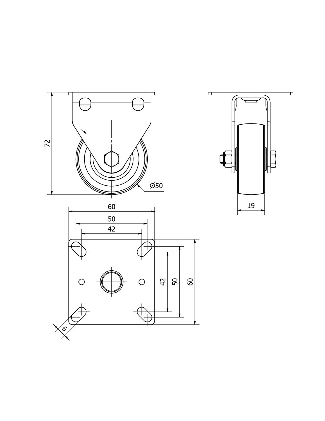 Rueda fija con placa y eje liso, color gris, material: poliamix - goma, carga máx. 40 kg, ø 5 cm