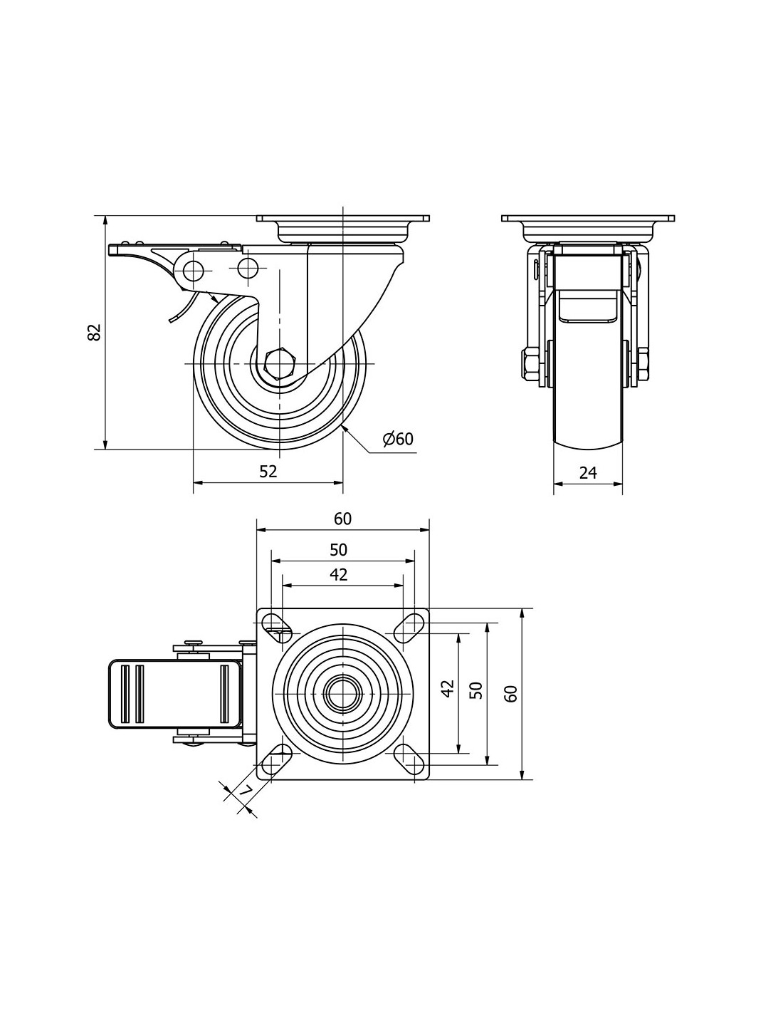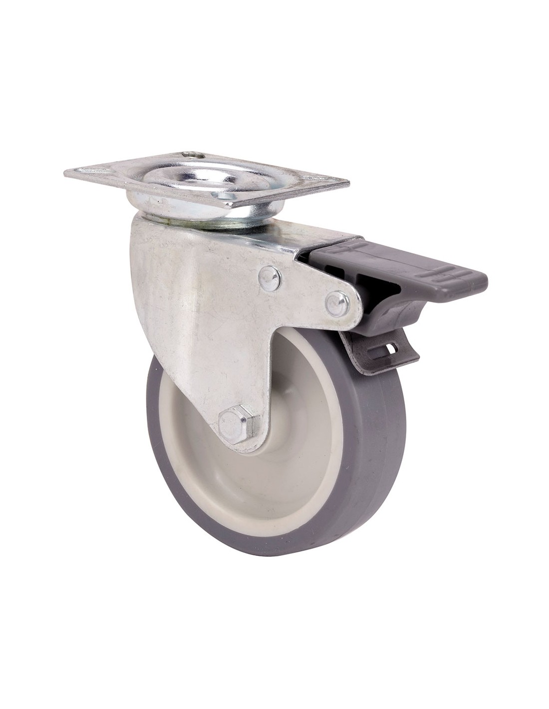 Rueda giratoria con placa, eje liso y freno, color gris, material: poliamix - goma, carga máx. 50 kg, ø 6 cm