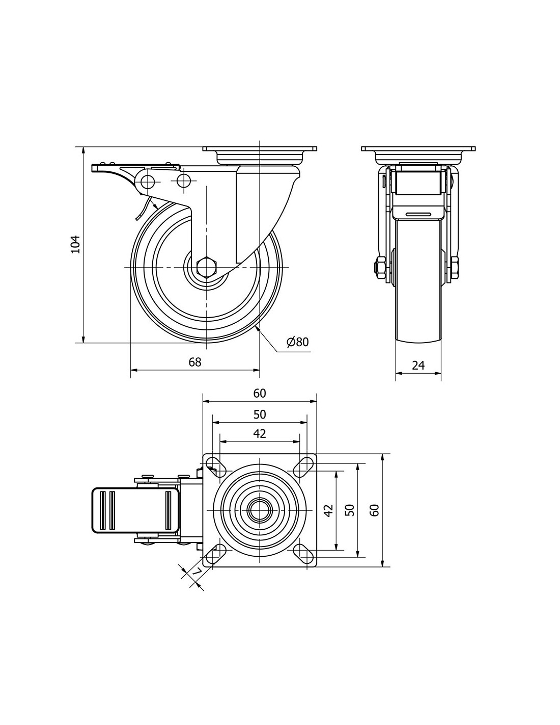 Rueda giratoria con placa, eje liso y freno, color gris, material: poliamix - goma, carga máx. 60 kg, ø 8 cm