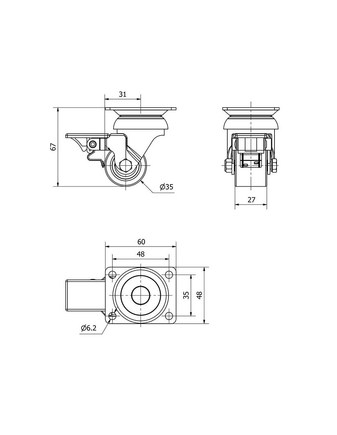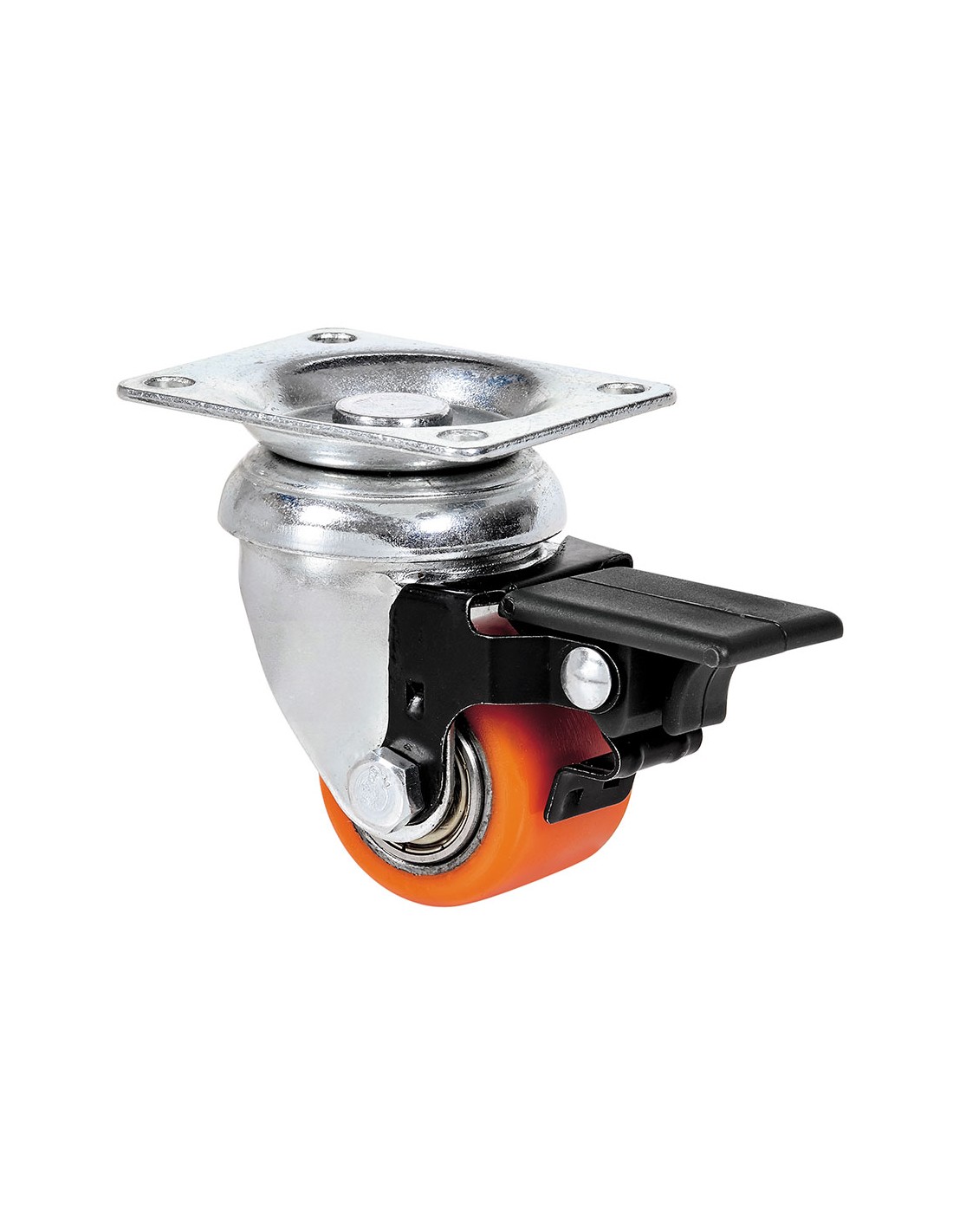 Rueda giratoria con placa y freno, rodamiento de bolas, material: núcleo metálico y banda de poliuretano vulcanizado con una dureza 95°, color naranja, carga máx. 100 kg, ø 3,5 cm