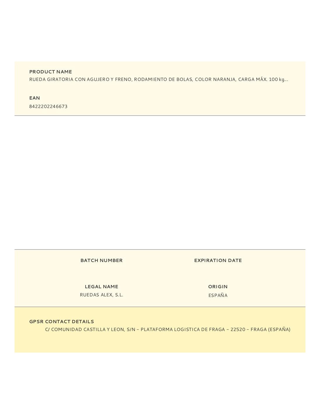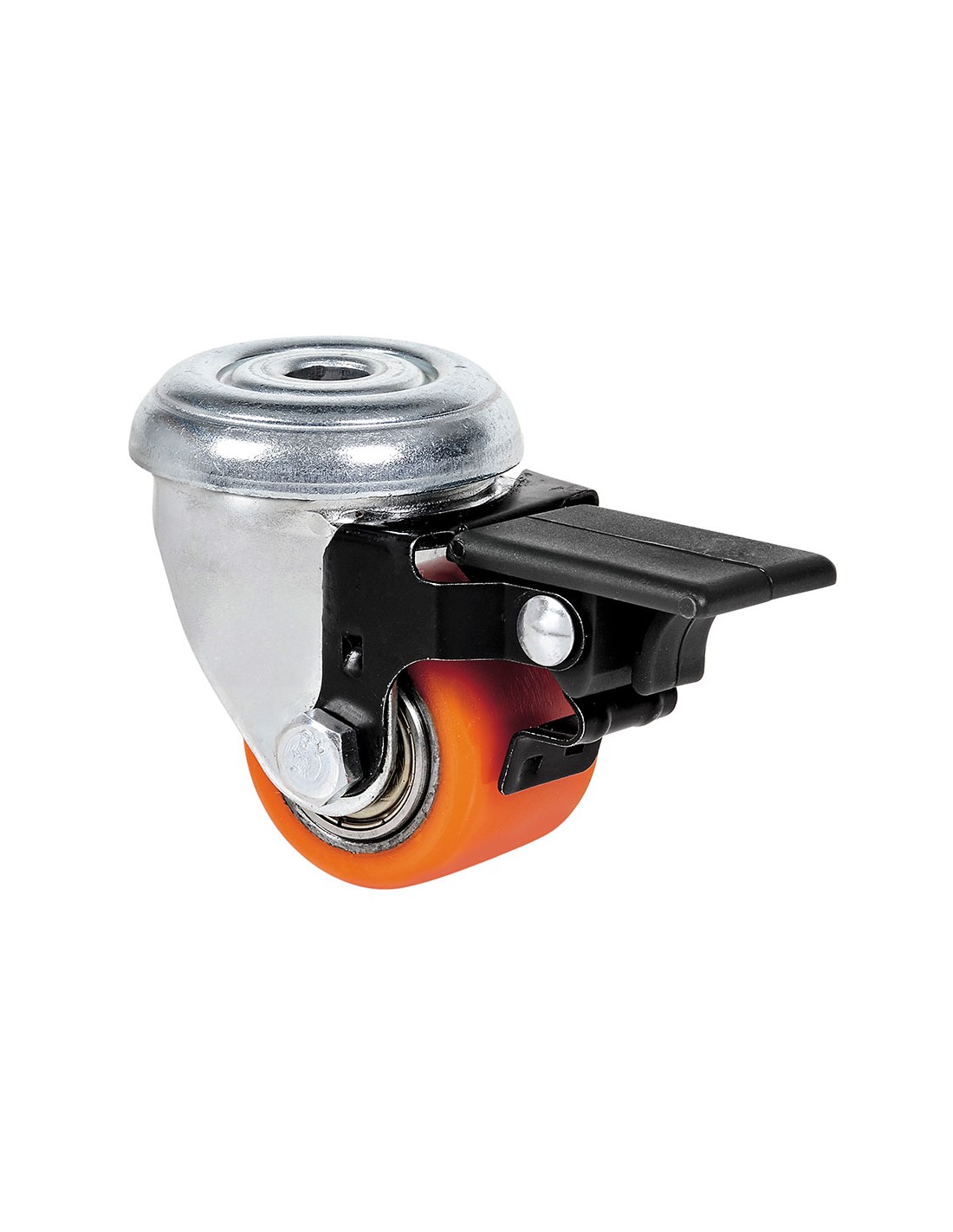 Rueda giratoria con agujero y freno, rodamiento de bolas, material:núcleo metálico y banda de poliuretano vulcanizado con una dureza 95°, color naranja, carga máx. 100 kg, ø 3,5 cm