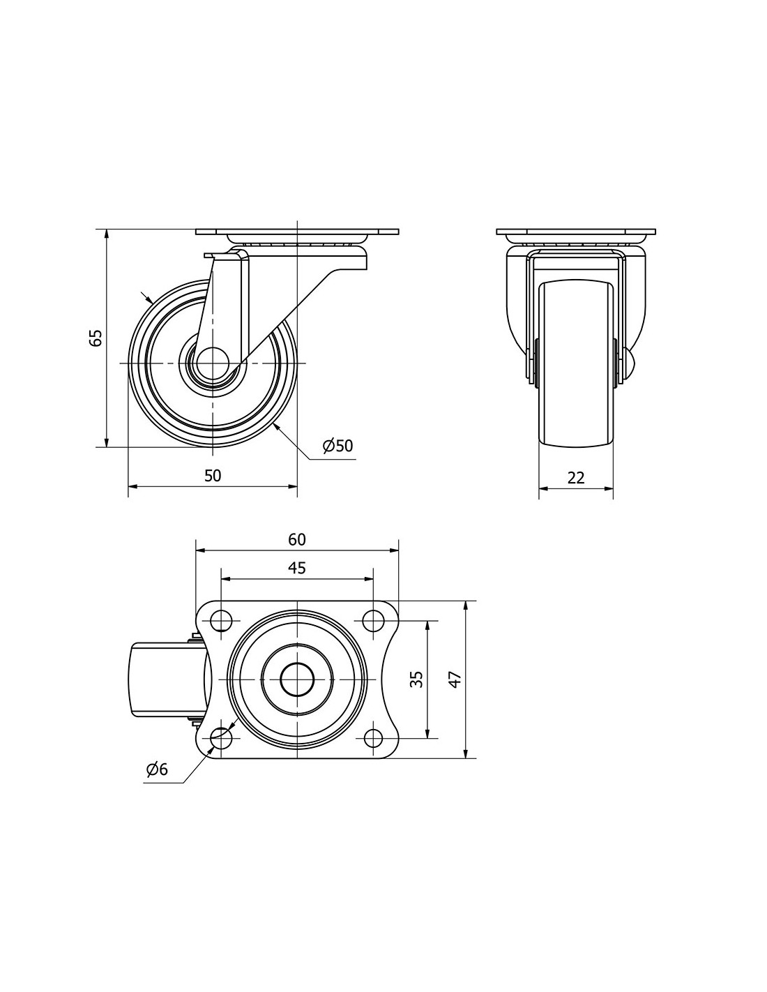 Rueda giratoria con placa y eje liso, color negro, material: polipropileno-plástico, carga máx. 30 kg, ø 5 cm
