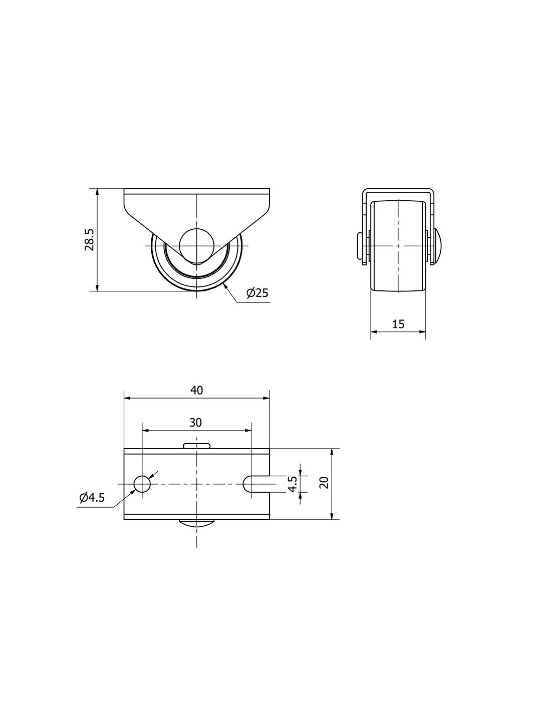 Rueda fija con placa y eje liso de dos fijaciones, color negro, material: polipropileno-plástico, carga máx. 40 kg, ø 2,5 cm