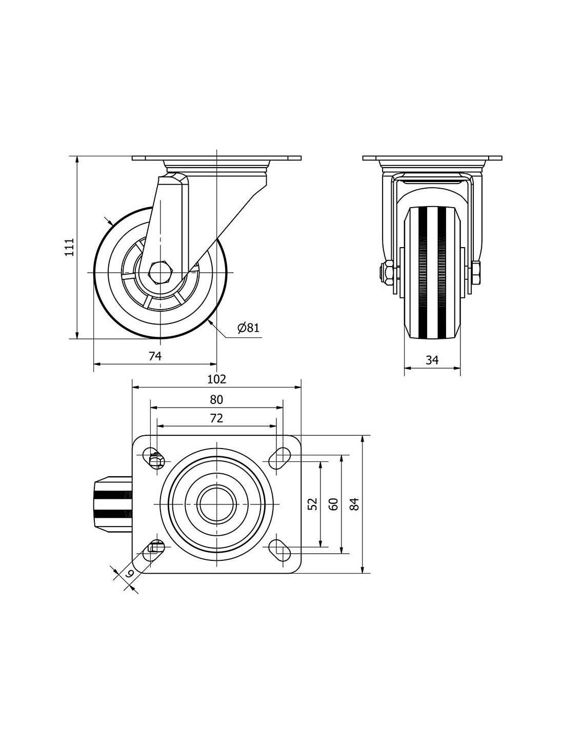 Rueda giratoria con placa y eje liso, color negro, material: poliamix - goma, carga máx. 60 kg, ø 8 cm