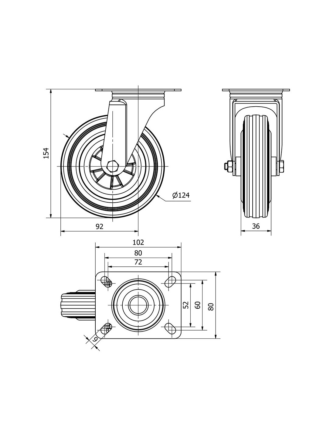 Rueda giratoria con placa y eje liso, color negro, material: poliamix - goma, carga máx. 110 kg, ø 12,5 cm