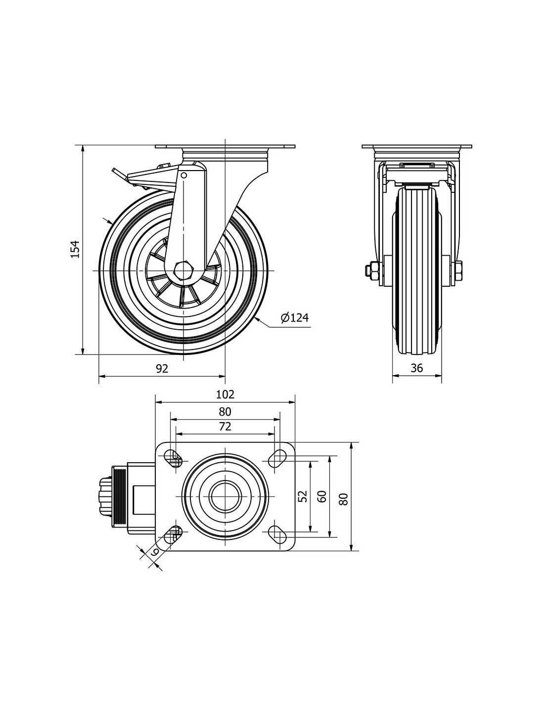 Rueda giratoria con placa, eje liso y freno, color negro, material: poliamix - goma, carga máx. 110 kg, ø 12,5 cm