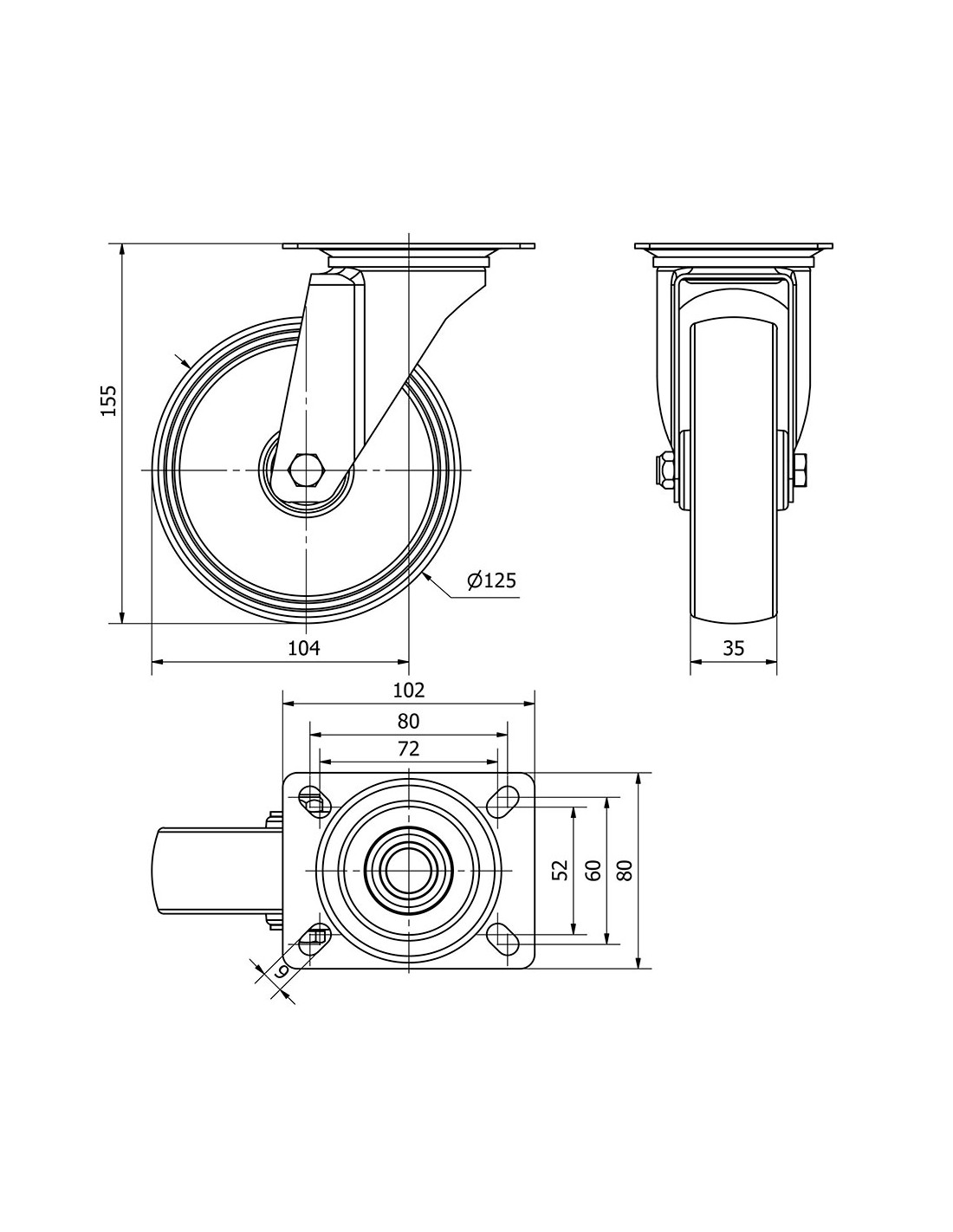 Rueda giratoria de goma con eje liso y agujero, color gris, carga máx 60 kg, ø 8 cm