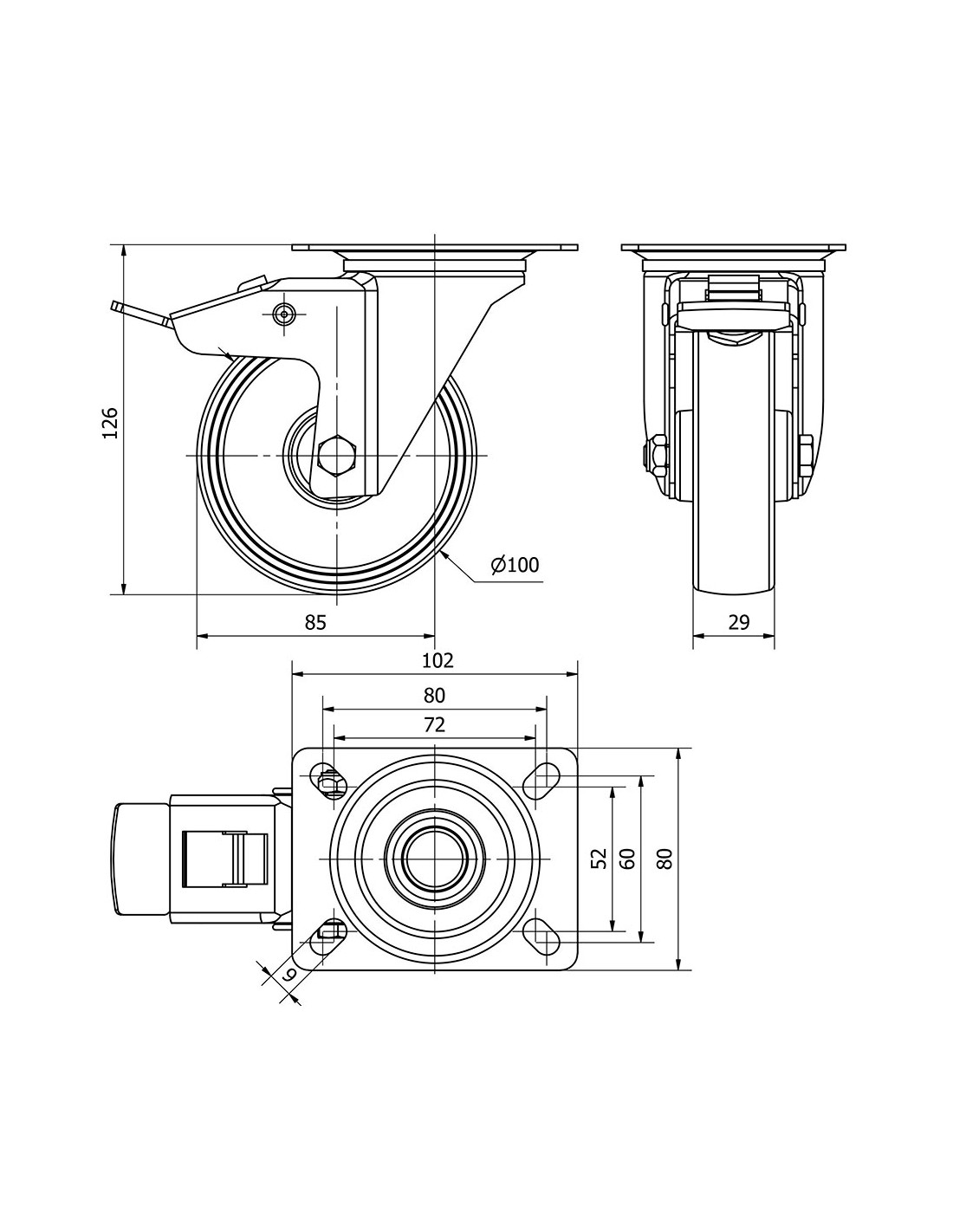 Rueda giratoria con placa, eje liso y freno, color blanco, material: poliamix, carga máx. 150 kg, ø 10 cm