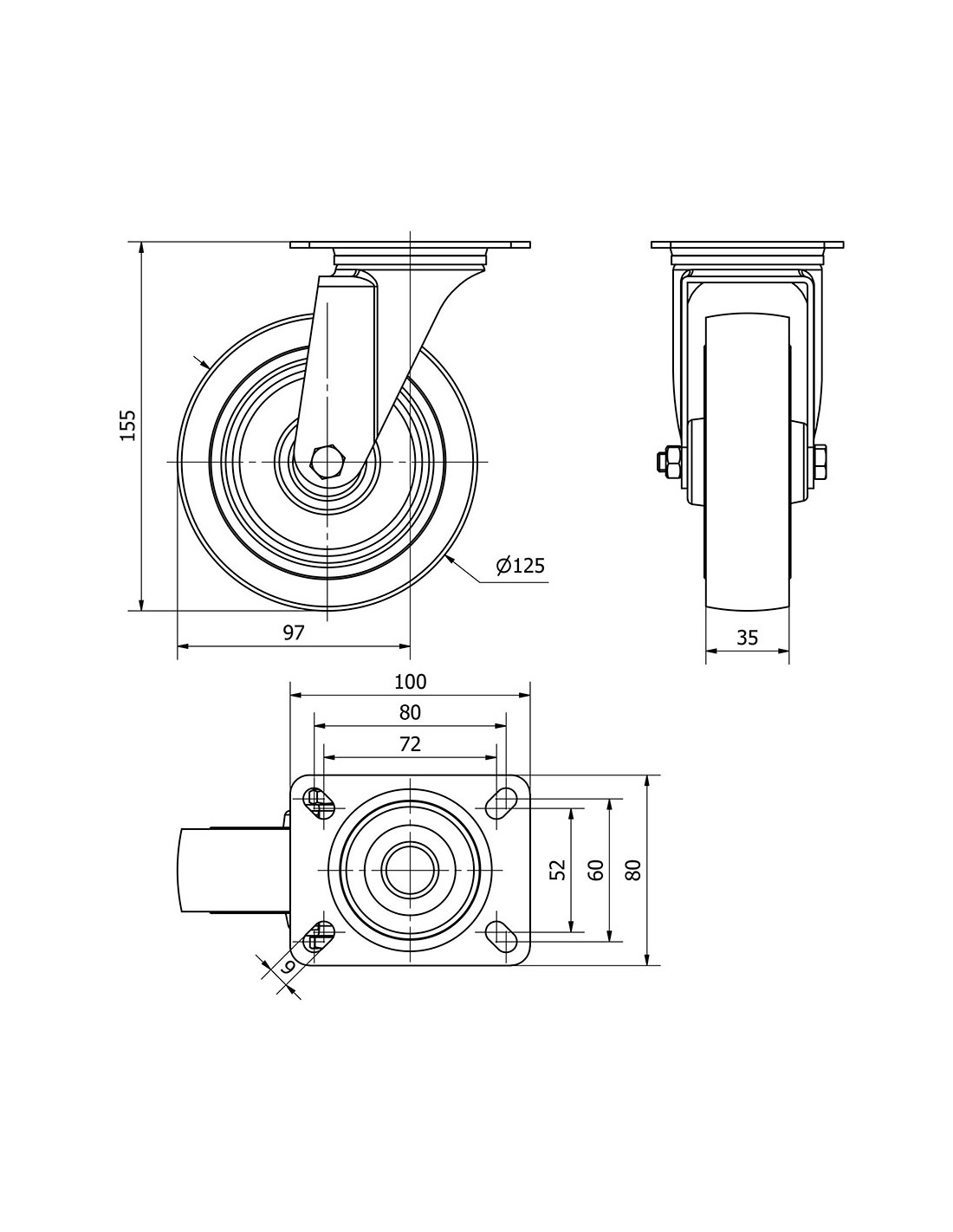 Rueda giratoria con placa y eje de rodillos, color azul, material: poliamix - goma, carga máx.130 kg, ø 12,5 cm