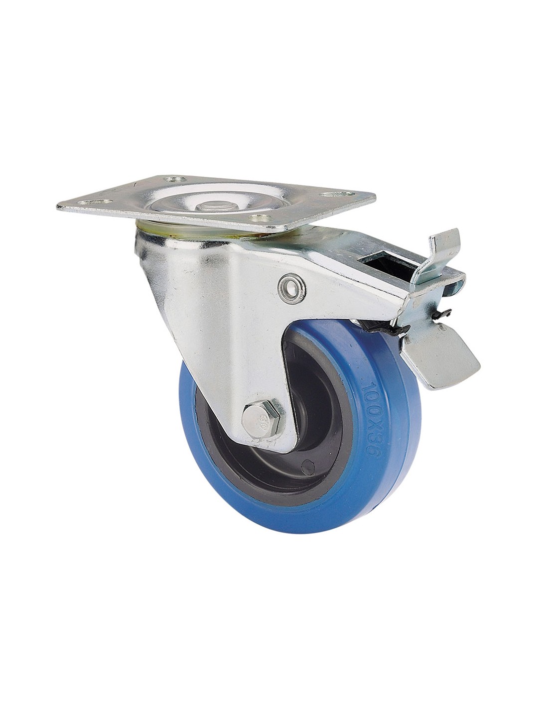 Rueda giratoria con placa eje de rodillos y freno, color azul, material: poliamix - goma, carga máx. 100 kg, ø 10 cm