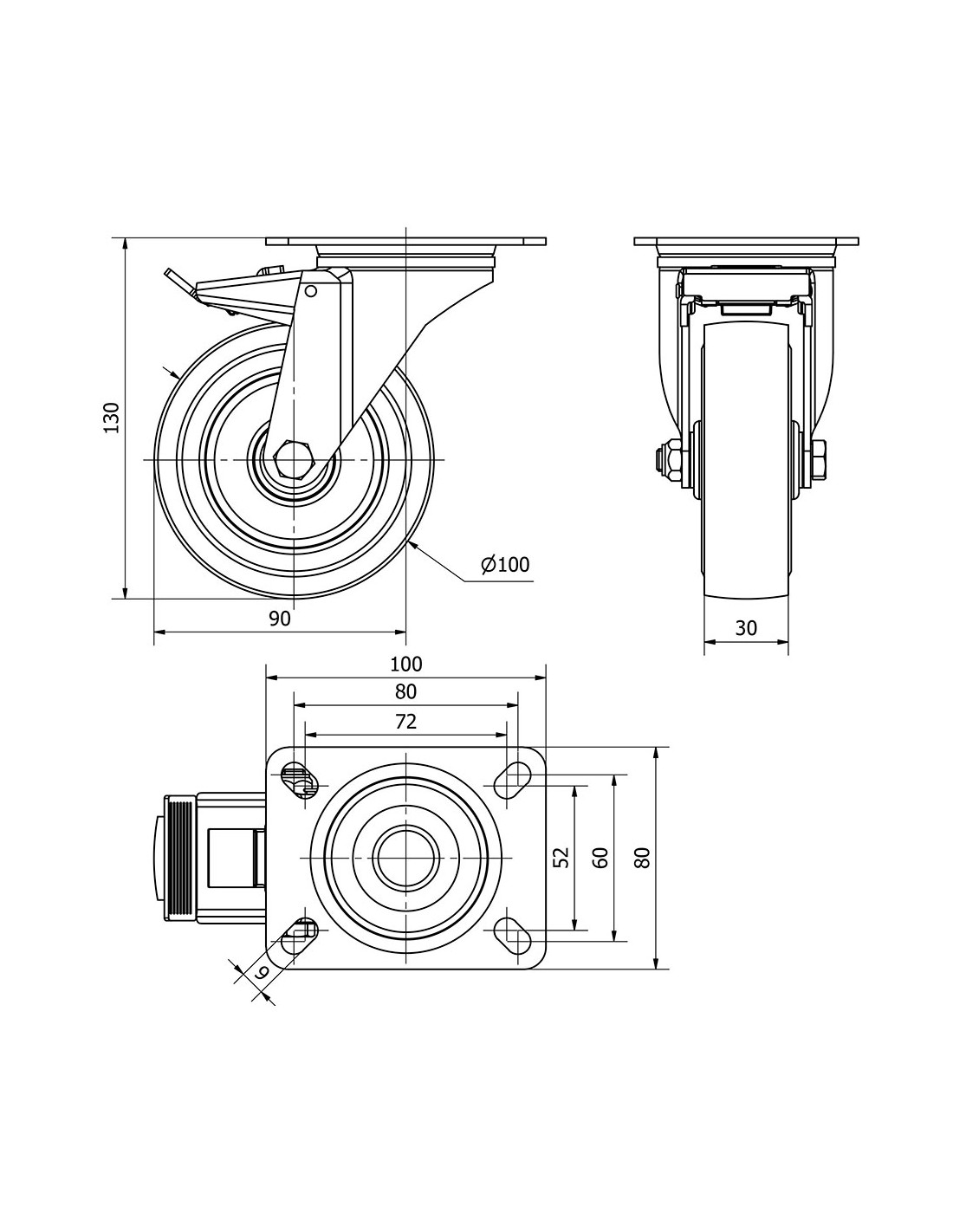 Rueda giratoria de goma con eje liso y agujero, color gris, carga máx 60 kg, ø 8 cm