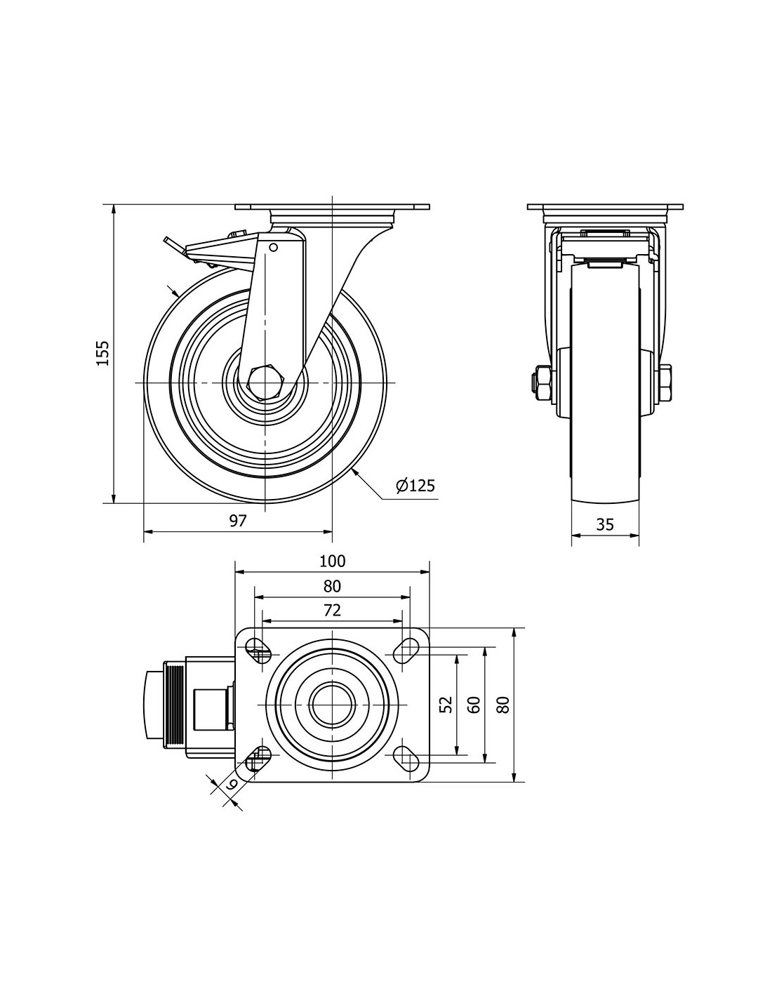 Rueda giratoria con placa, eje de rodillos y freno, color azul, material: poliamix - goma, carga máx. 130 kg, ø 12,5 cm