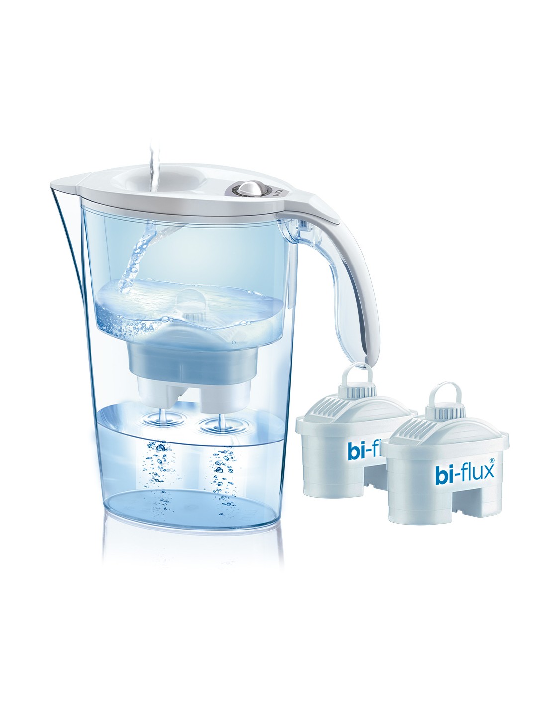 Pack de 1 jarra de filtración de 2,3 litros j31-cc blanca + 2 filtros bi-flux. cada filtro tiene una duración de 150 litros o 1 mes. la jarra tiene un timer mecánico para controlar la duración del filtro. el filtro bi- flux reduce el cloro, la cal, metales pesados, contaminantes químicos y algunos pesticidas y herbicidas