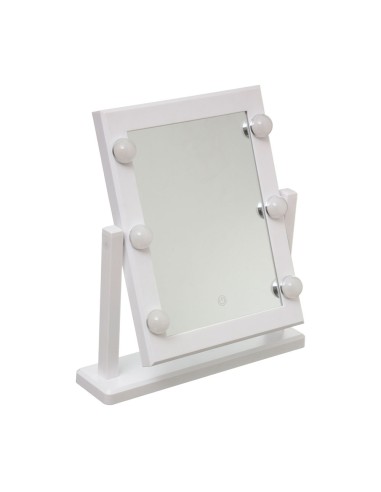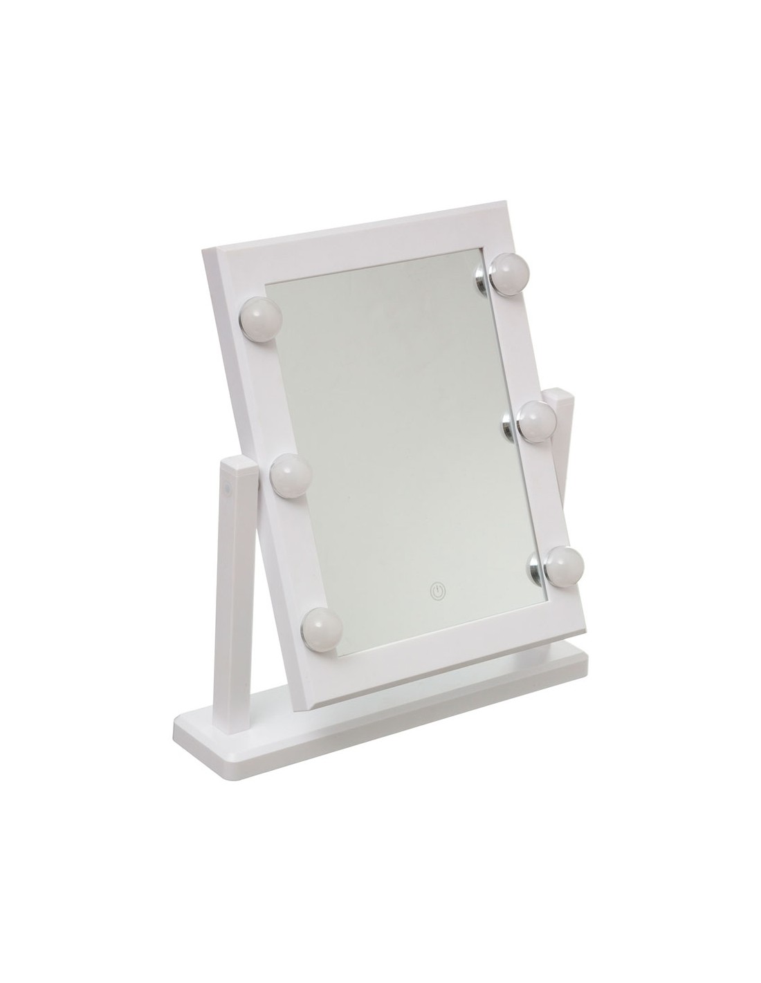 Espejo led colección "hollywood" dimensiones: 37x9x40,5cm (ancho/fondo/alto) blanco funciona a pilas 4xlr6/aa no incluidas. 2 funciones de iluminación táctil: luz fría o cálida espejo giratorio 180° 6 leds colores / modelos surtidos