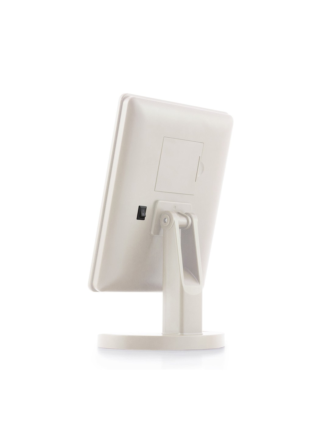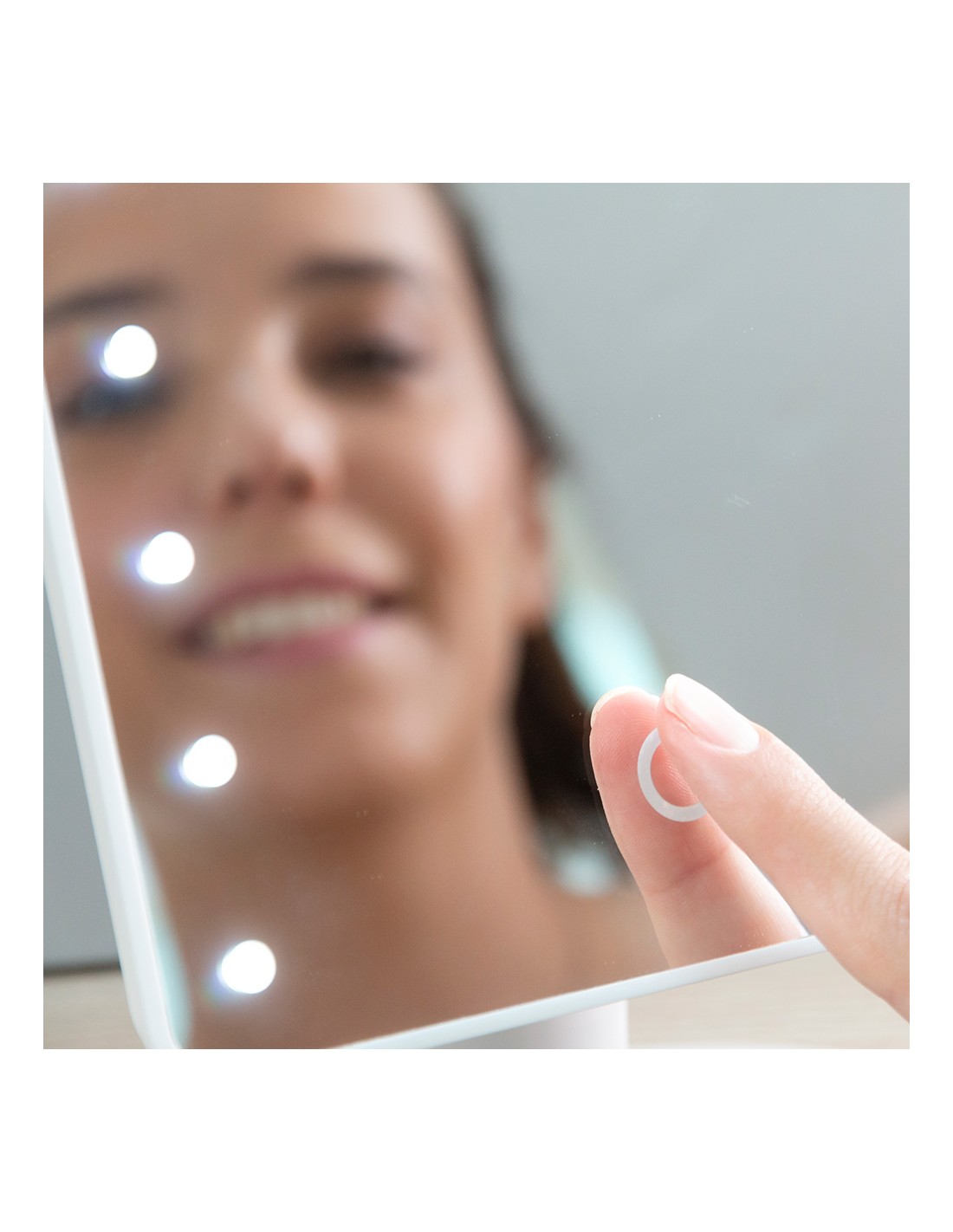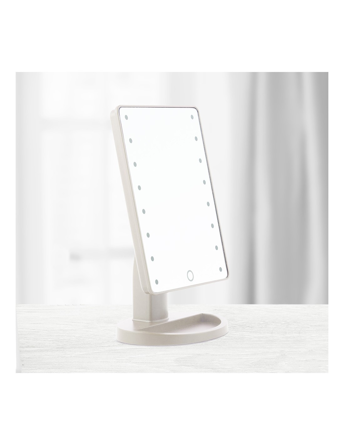 Espejo de led táctil de sobremesa.fabricado en abs y vidrio, diseño moderno y funcional, rotación de 180°, 16 led de luz blanca (intensidad regulable), interruptor on/off en la parte trasera, botón táctil en la parte frontal (encendido, apagado, +/-intensidad), funciona con pilas (4xaa, no incluidas), medidas aprox.: 17x27x12cm.
