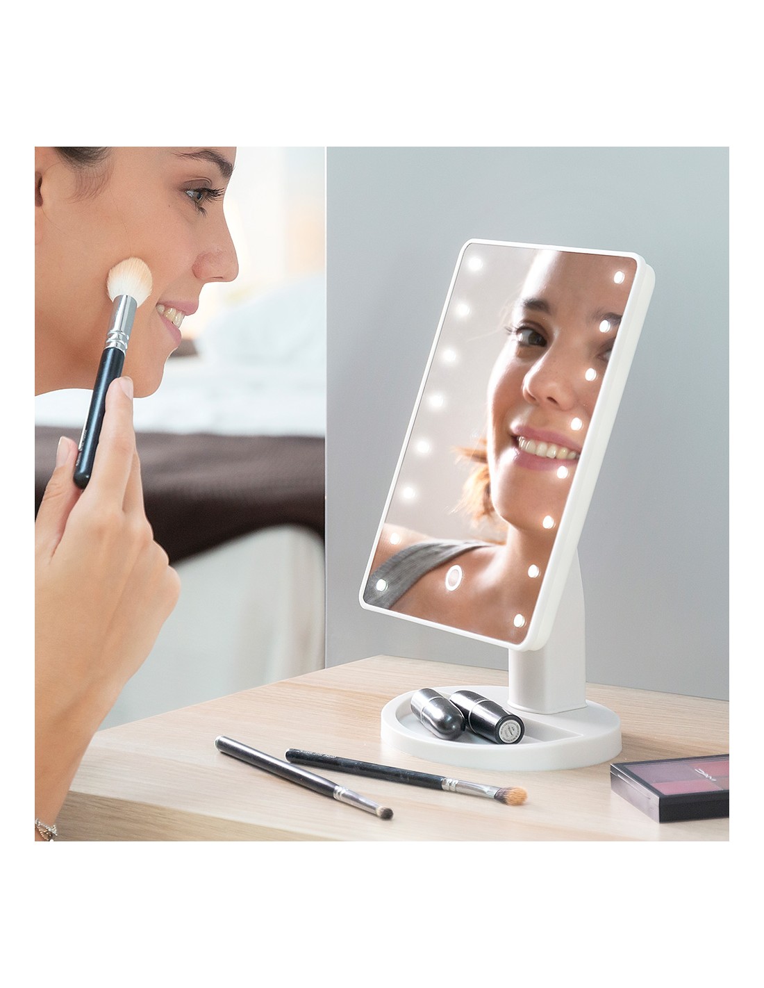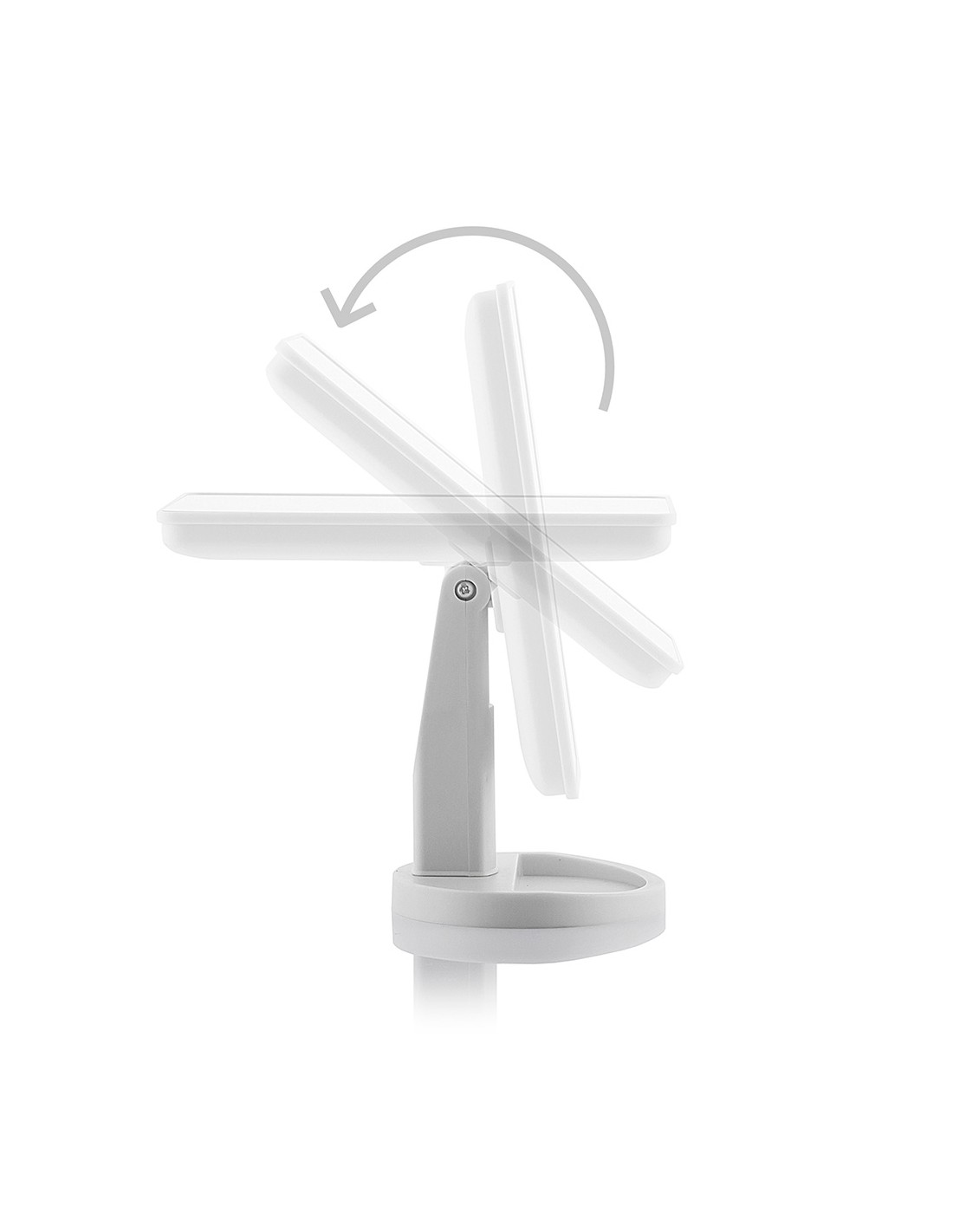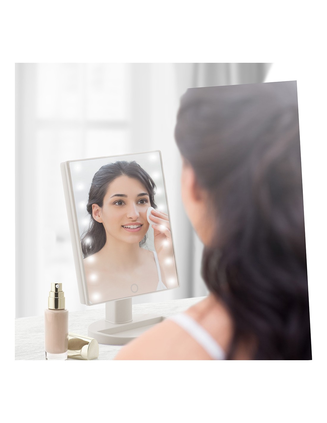 Espejo de led táctil de sobremesa.fabricado en abs y vidrio, diseño moderno y funcional, rotación de 180°, 16 led de luz blanca (intensidad regulable), interruptor on/off en la parte trasera, botón táctil en la parte frontal (encendido, apagado, +/-intensidad), funciona con pilas (4xaa, no incluidas), medidas aprox.: 17x27x12cm.