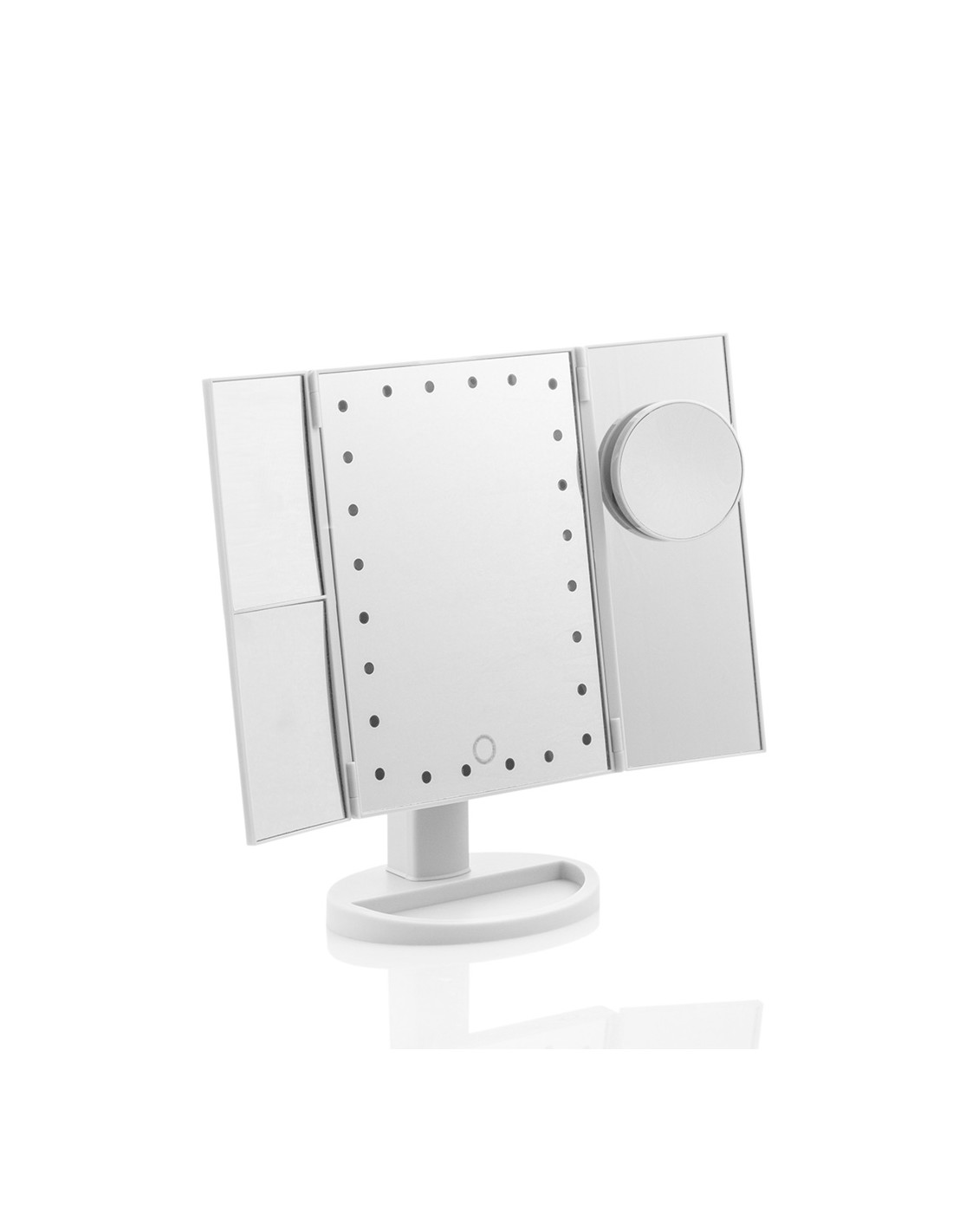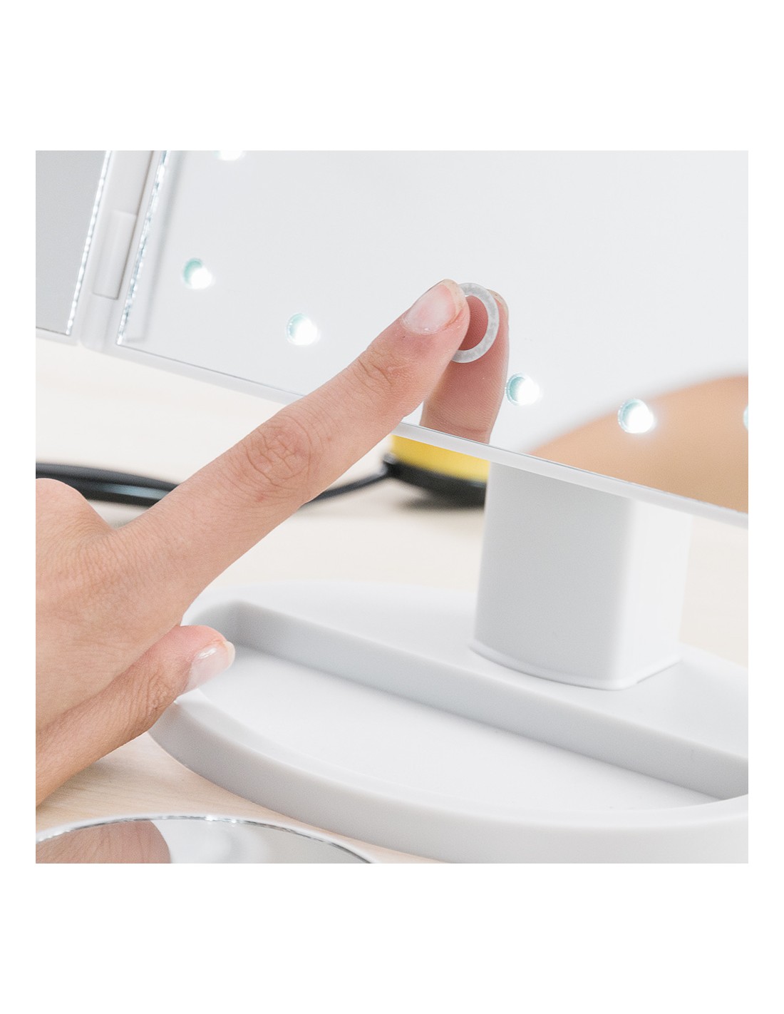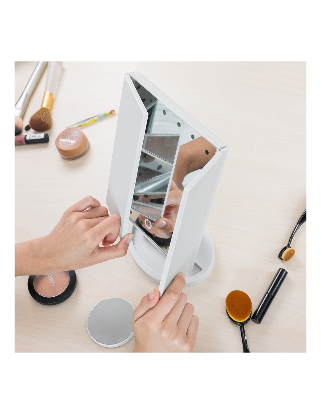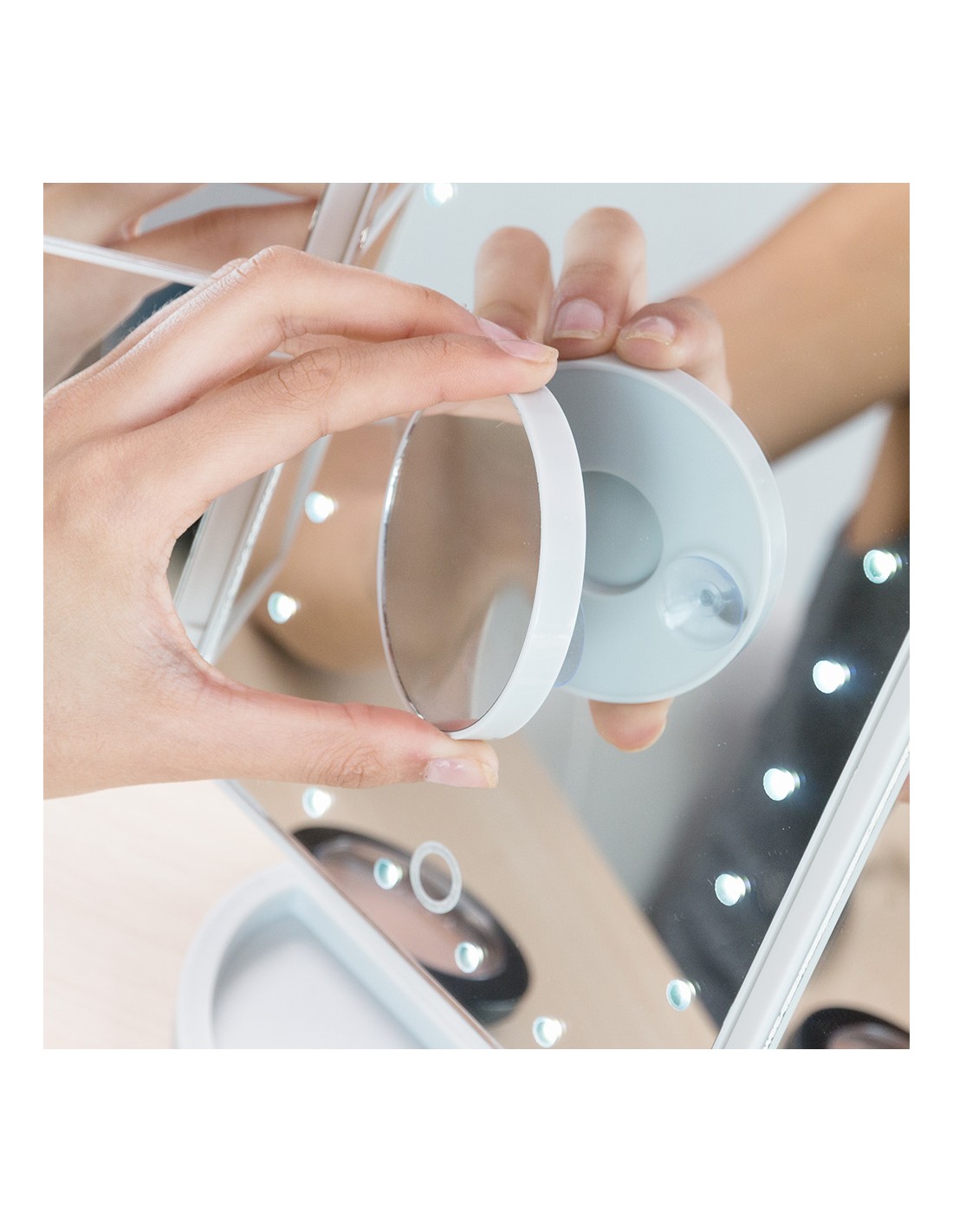 Espejo led de aumento 4 en 1 innovagoods. un espejo de sobremesa muy práctico para maquillarse, peinarse, depilarse, etc., con la máxima precisión y comodidad. fabricado en abs diseño plegable, moderno y funcional, 24 led de luz blanca, reclinable hasta 360° varias zonas de aumento (x1, x2 y x3), espejo adicional redondo con ventosas (aprox. 7,5x1cm – aumento: x10), base extraíble con espacio para colocar utensilios (pinzas de depilar, pintalabios, etc.), interruptor on/off en la parte trasera, botón táctil de encendido y apagado en la parte frontal, funciona con pilas (4xaa, no incluidas) o mediante conexión usb (incluye cable usb). medidas aprox.: 18x29x12cm.
