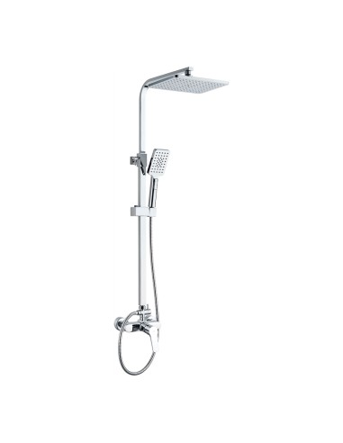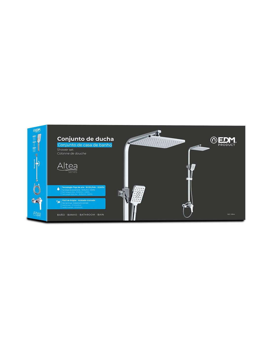 Conjunto de ducha con monomando, rociador superior, flexo y mango de ducha. serie altea. edm. cuenta con un mango de ducha con tres funciones y con una manguera cromada flexible de 1,5m que puedes colocarla en el soporte regulable en altura. con una barra de ducha extensible 70-115cm que se adapta a las distintas alturas. acabado cromado. montaje de pared.