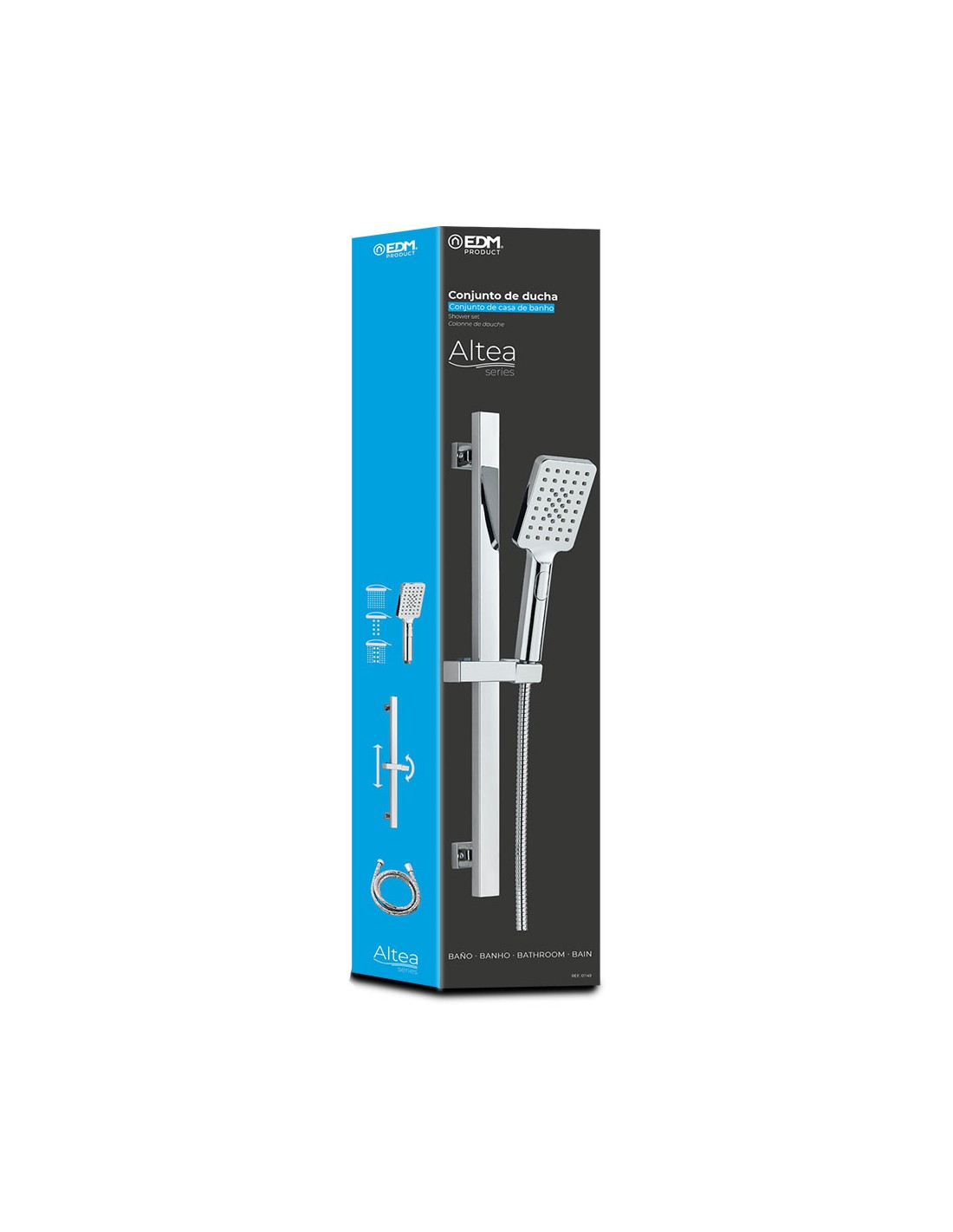 Barra de ducha con flexo y mango. serie altea edm cuenta con un mango de ducha con tres funciones y con una manguera cromada flexible de 1,5m que puedes colocarla en el soporte regulable en altura. con una barra de ducha 70cm que se adapta a las distintas alturas. acabado cromado. montaje de pared.