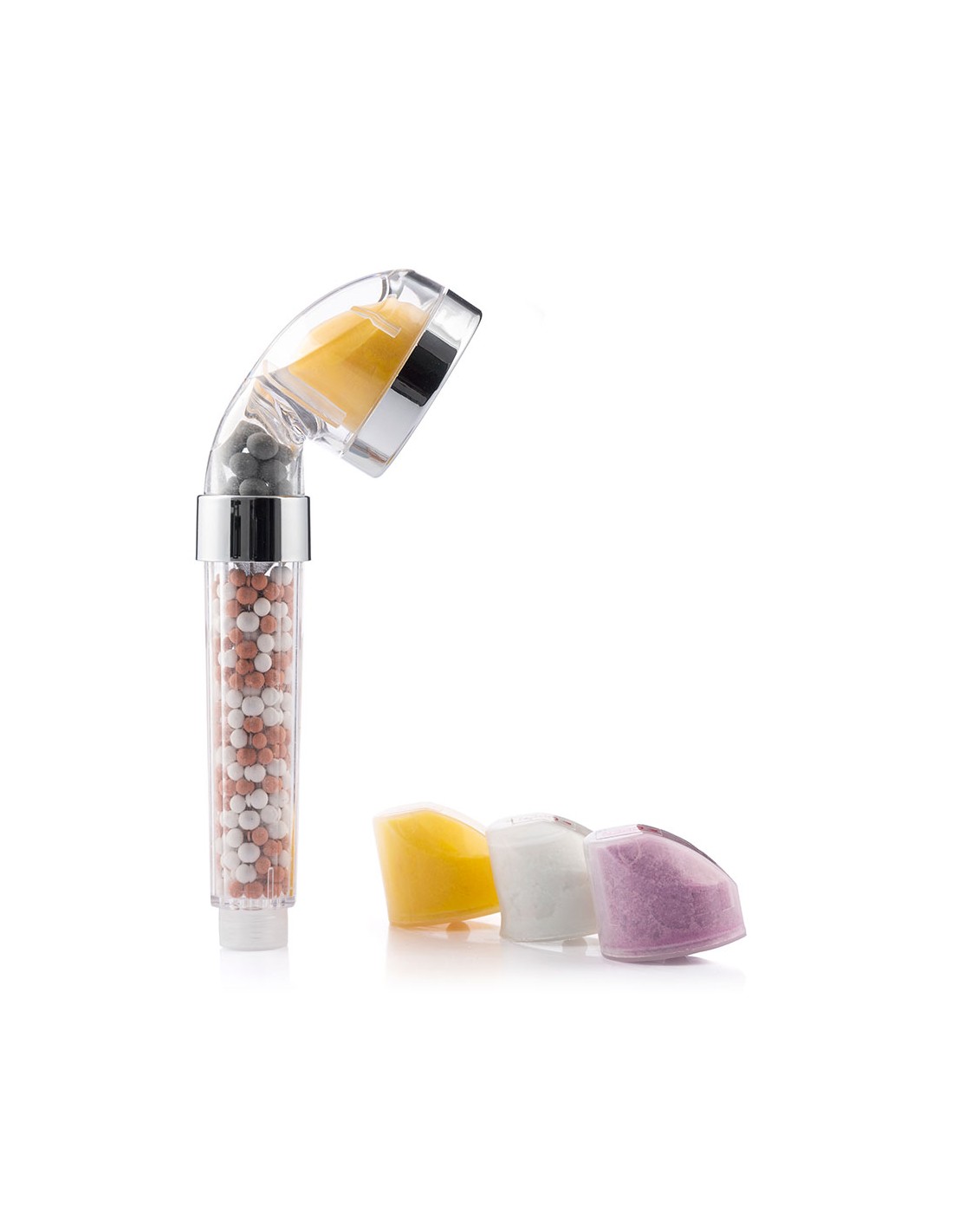 Ecoducha multifunción con aromaterapia y minerales shosence v0103229 innovagoods. una ecoducha multifunción con aromaterapia que proporciona numerosos efectos beneficiosos y relajantes para la piel gracias a sus cartuchos de aromas (jazmín, lavanda y limón) y sus componentes minerales (maifán, zeolita y turmalina). las piedras potencian una mineralización de activación antibacteriana y actúan como filtro iónico eco (iones negativos que ablandan el agua y mejoran la hidratación). las piedras de maifán filtran los metales pesados, potenciando los minerales beneficiosos del agua.