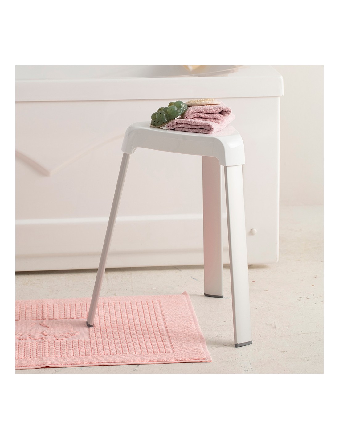Taburete de baño, patas de aluminio color gris, pies antideslizantes, asiento plástico blanco, 25 x 29 x 45 cm