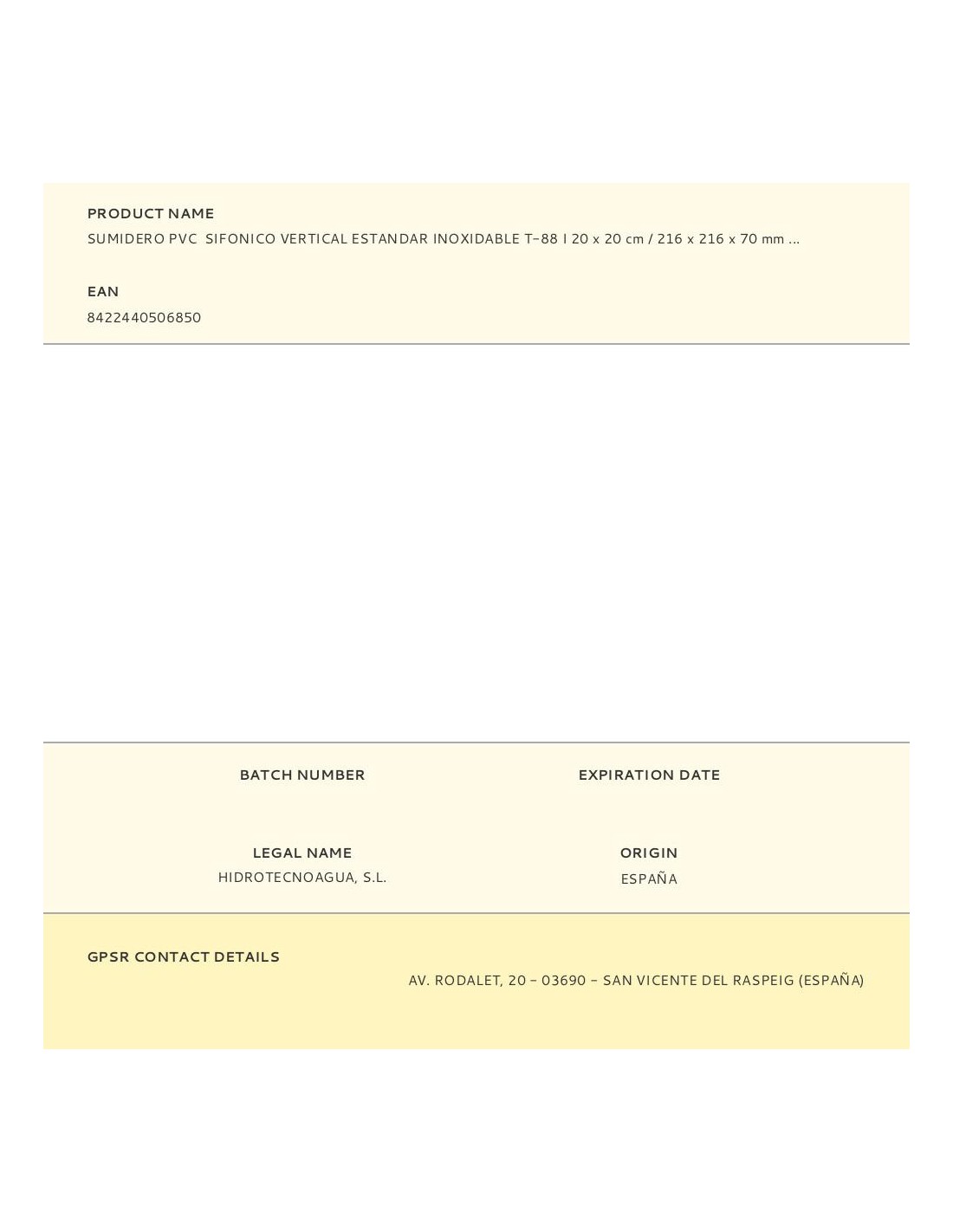 Sumidero pvc sifonico vertical estandar inoxidable t-88 i 20 x 20 cm / ø110 - 90 mm. 216 x 216 x 70 mm