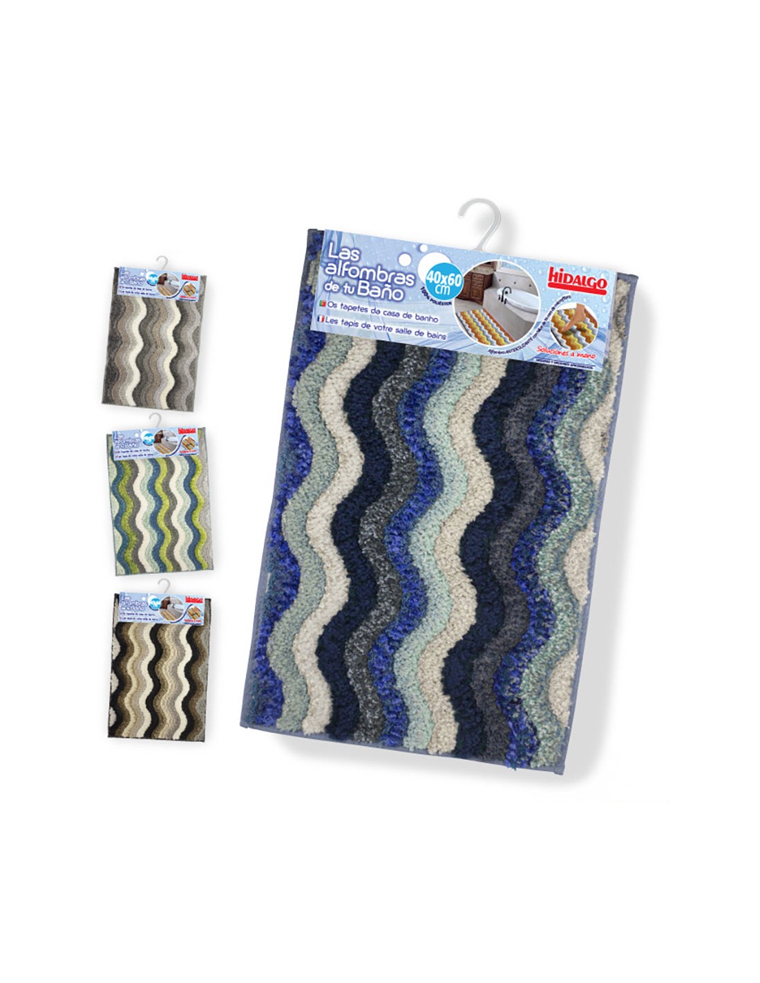 Alfombra de baño zig zag rectangular, modelos variados, colores surtidos, 100% poliéster con hilos de 14 mm de microfibra, el dorso esta fabricado con latex que evita los deslizamientos. lavable a 30c. dimensiones 40 x 60 cm