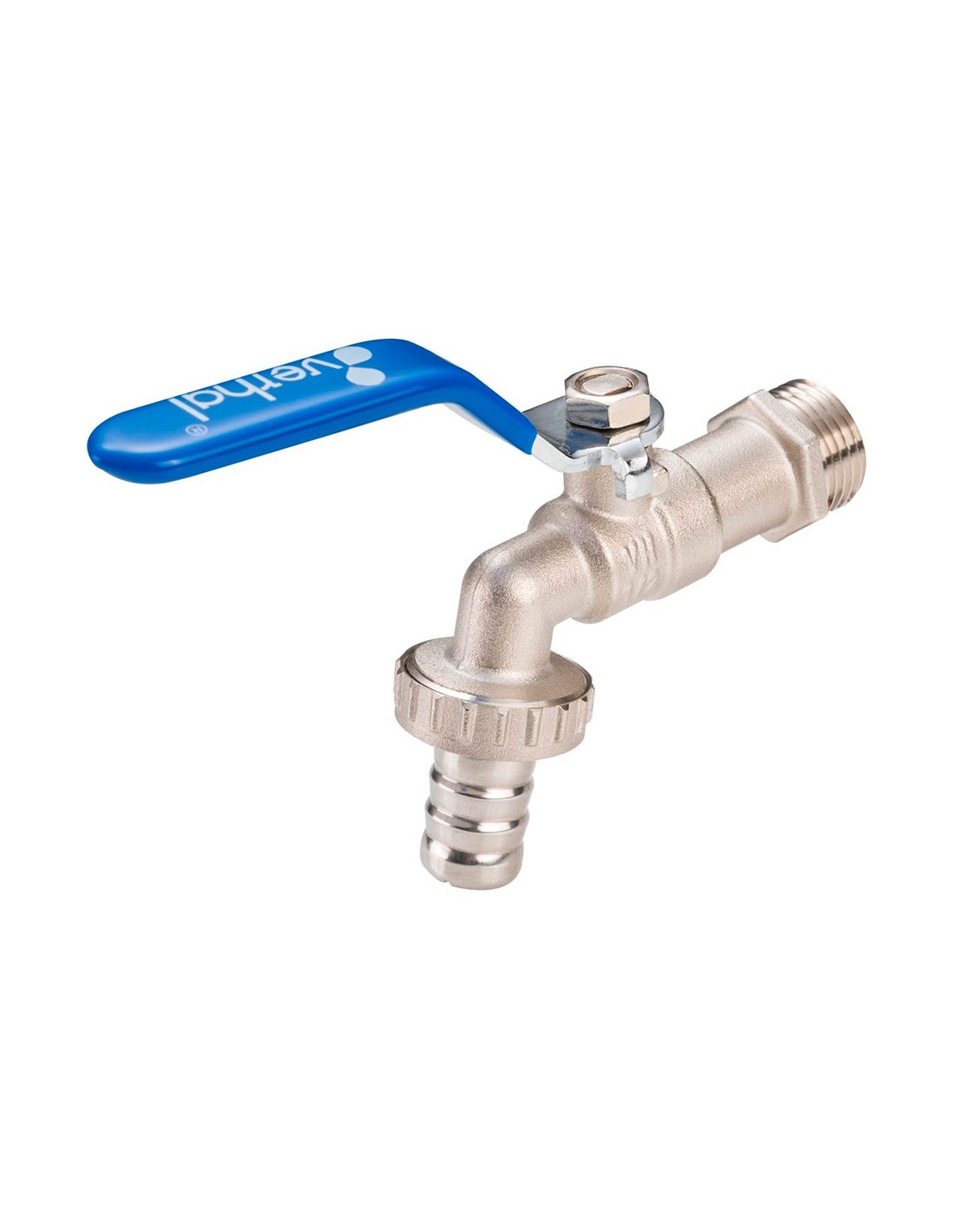 Grifo esfera, racor manguera, 1/2" x 3/4" presión nominal 16 bar, temperatura máxima 75°c, juntas nbr, asiento teflón, entrada rosca gas, cierre 1/4 vuelta, cuerpo latón niquelado, maneta: acero cromado