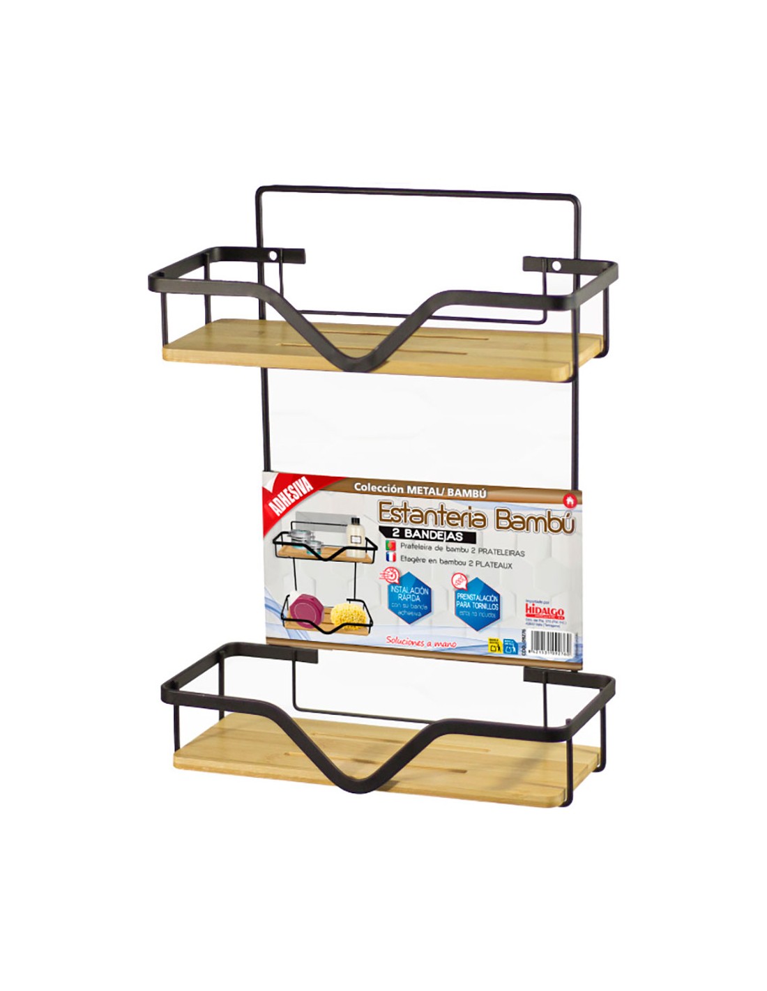 Estante doble organizador de diseño moderno y funcional, fabricado en estructura metálica con repisas de bambú natural, con sistema de fijación adhesiva para instalación sin perforaciones y orificios preinstalados para una instalación adicional mediante tornillos (no incluidos) para baños, cocinas o espacios reducidos donde se requiera optimizar el almacenamiento 27,5 x 12 x 37 cm