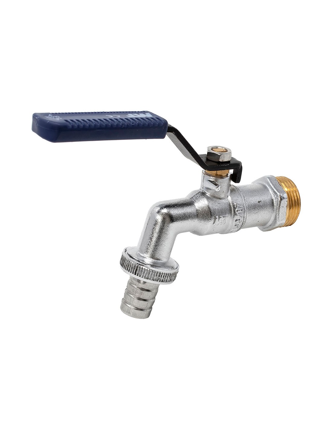 Grifo de esfera para jardín silver pn16 modelo export ø½ x ¾ pulg con racor a manguera 15 mm y palanca ergonómica de acero al carbono con recubrimiento anticorrosión azul cuerpo latón cw617n niquelado, cierre ptfe rosca iso 228/1 (din 259), cierre rápido (1/4 vuelta), maneta para menos esfuerzo máximo 16 bar, -10 y 80°c sistema antihielo uso en agua fría y caliente