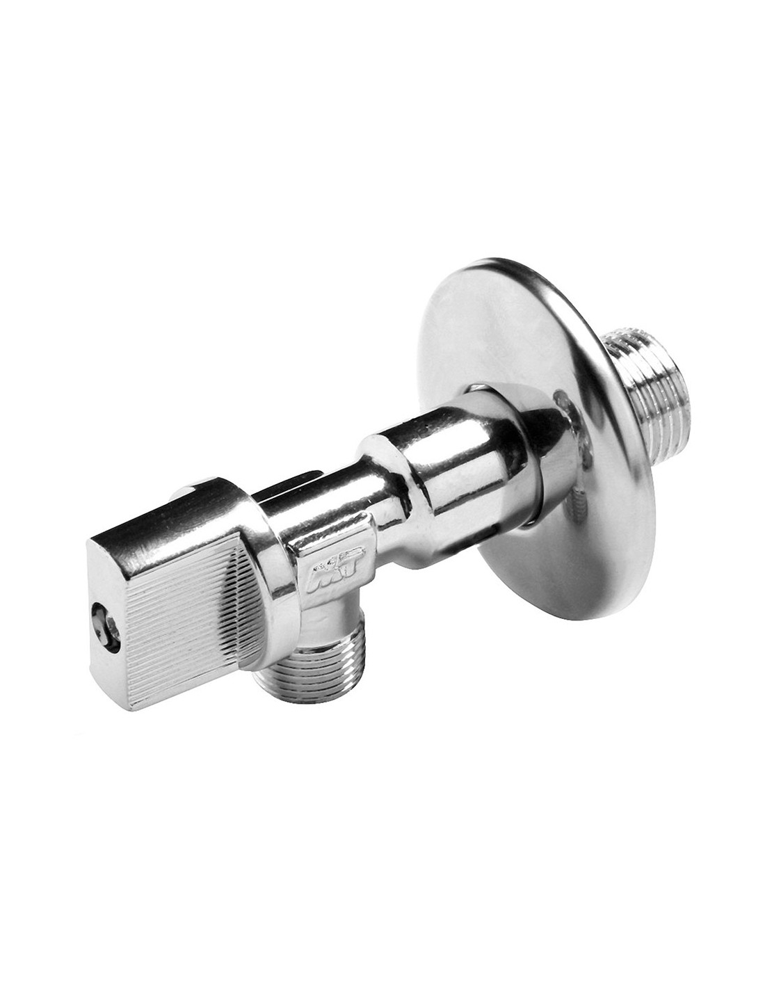 Válvula escuadra antical con mando metálico ø½ x 3/8 pulg cuerpo latón cw617n cromado, florón acero inoxidable, doble junta nbr, rosca iso 228/1 (din 259), cierre rápido (1/4 vuelta), presión nominal 10 bar (150 psi), -10 a 90°c dispone de un mecanismo de apertura y cierre compuesto por un polímero que evita la adhesión de la cal a la superficie longitud 79,5 mm