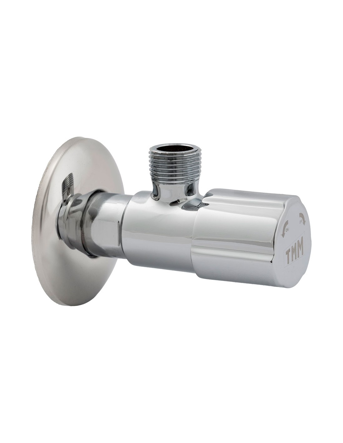 Válvula de escuadra cerámica con mando metálico, decorativa, rosca de entrada de ½ pulg - rosca de salida 3/8 pulg, caudal 30 l/min, cierre ¼ vuelta, presión max 16 bar, temperatura máx 90°c, sistema de cierre antical