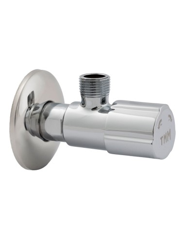 Válvula de escuadra cerámica con mando metálico decorativo, ½ pulg x ¾ pulg, caudal 33 l/min, cierre ¼ vuelta, presión nominal 16 bar, temperatura entre 0°c y 100°c, sistema antical