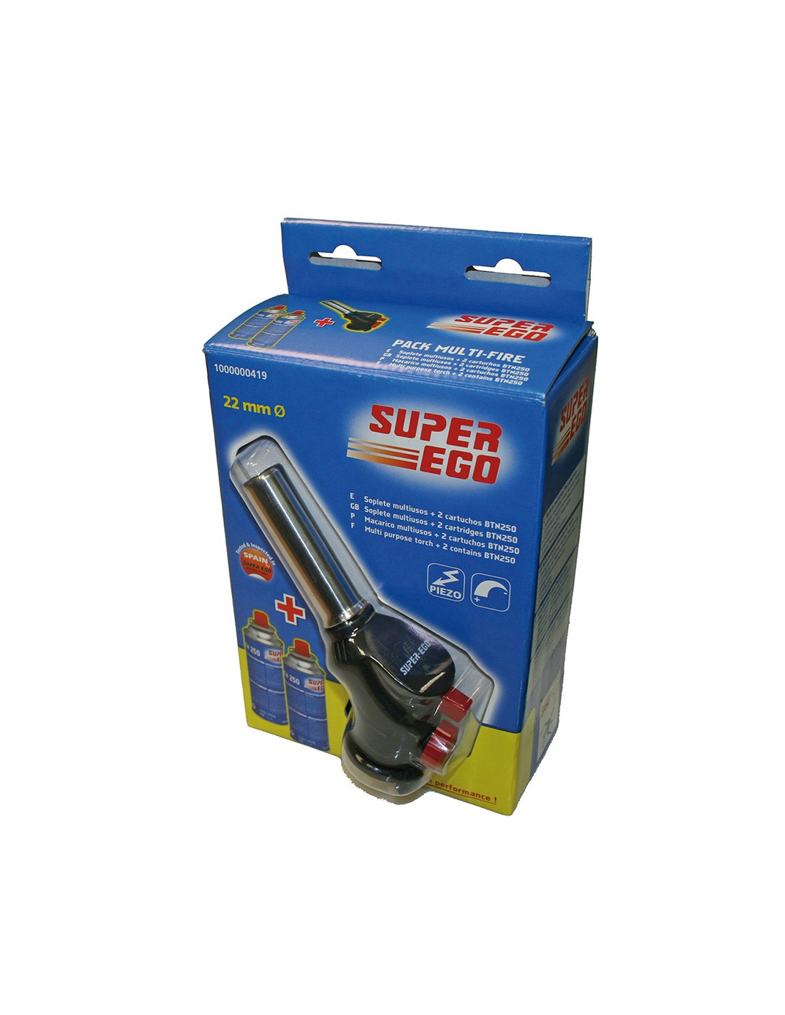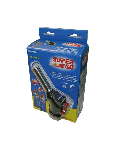 Soplete multi-fire + 2 cartuchos btn250 soplete multiusos piezoelectrico. usos: flambear, caramelizar, tostar, dar color y textura a la comida y mejorar la presentacion de platos. encender barbacoas y fuegos bajos. descongelar tuberias. trabajos manuales y modelismo. trabaja en posicion invertida. ø22cm. super ego
