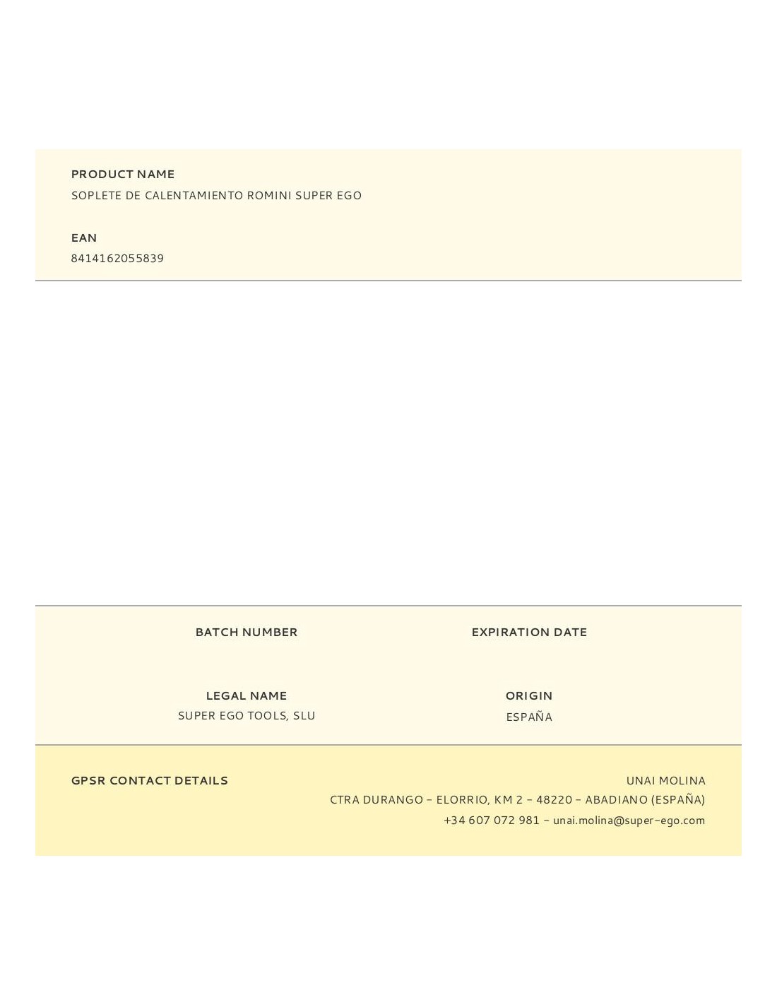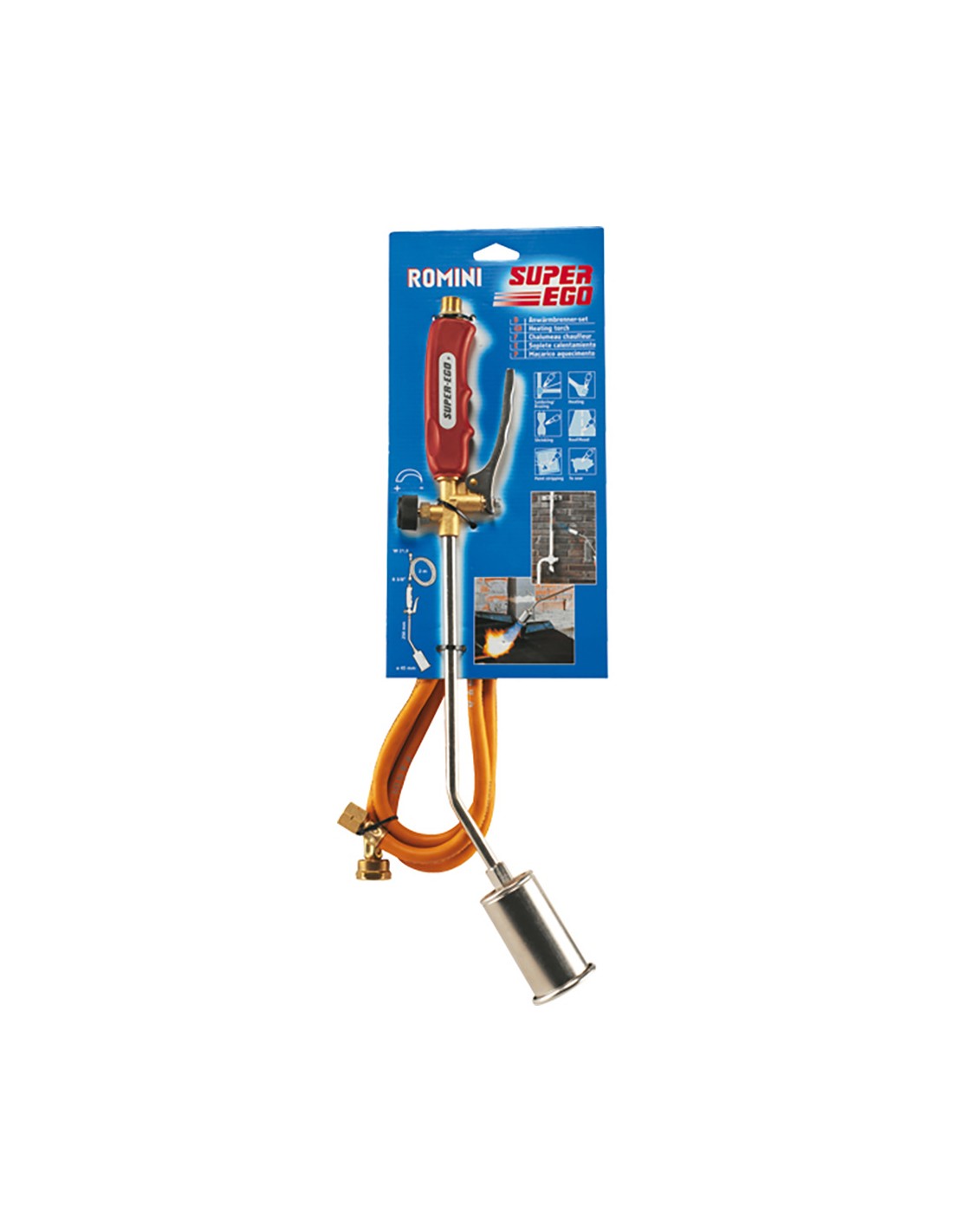 Soplete de calentamiento romini. boquilla antiviento de ø45mm lanza de 250mm. mango ergonomico con regulador de llama y gatillo de seguridad para un control permanente de la llama. manguera 2m. conexion r3/8"l-w21,8". super ego