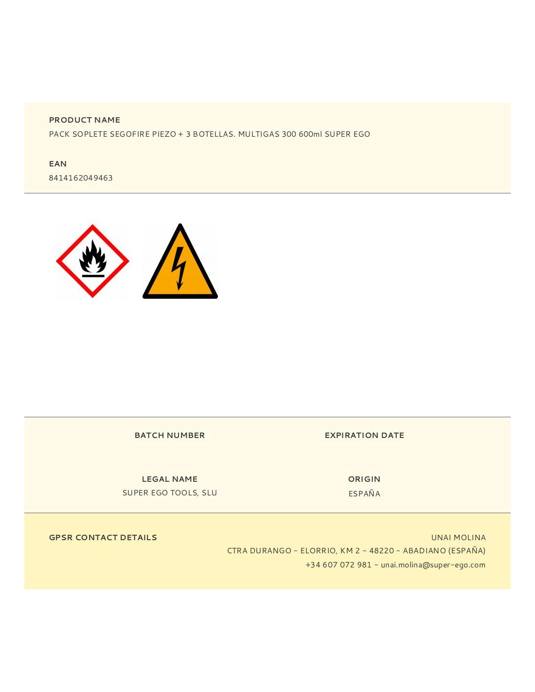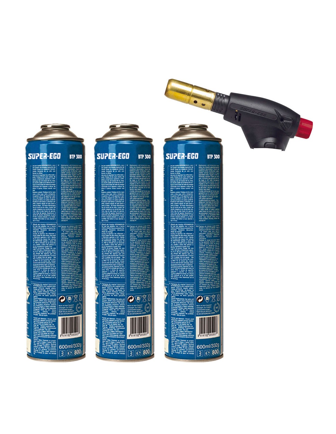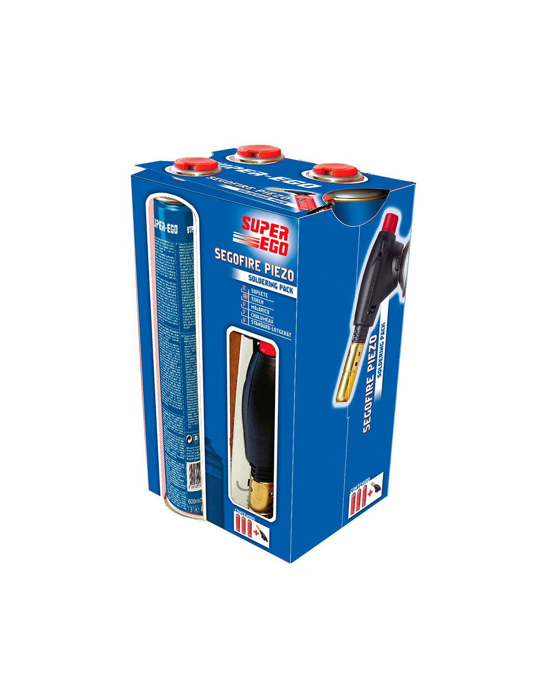 Pack soplete segofire piezo + 3 botellas. multigas 300. para soldadura blanda y fuerte. con encendido piezo eléctrico. incluye 3 cartuchos de multigas 300 (ref. seh020300). 600ml 332g medidas: 15x13x25cm peso: 1,4kg super ego