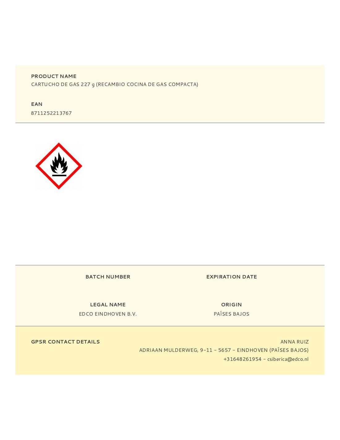 Cartucho de gas 227g. gas combustible bajo presión. proteger de la luz directa del sol. no exponer a temperaturas superiores a 50c. mantener fuera del alcance de los niños. cartucho de gas cumple con la norma en417. sigue las instrucciones del dispositivo para que le vas a usar. mantenga el cartucho de gas en un área bien ventilada. mantenga lejos de fuentes de ignición. no fumar. deshacerte del cartucho vacío de una manera segura. reemplazar el cartucho hacerlo en una zona bien ventilada. cierra la válvula del dispositivo. retire el cartucho vacío. reemplazar la junta del precinto de la unidad si está dañado o ausente. usar este cartucho sólo con cocinas de gas st-7000, ms-2000, km5000, a150.421. aviso: no rellenar otra vez. no perforar ni tirar en fuego incluso después de su uso