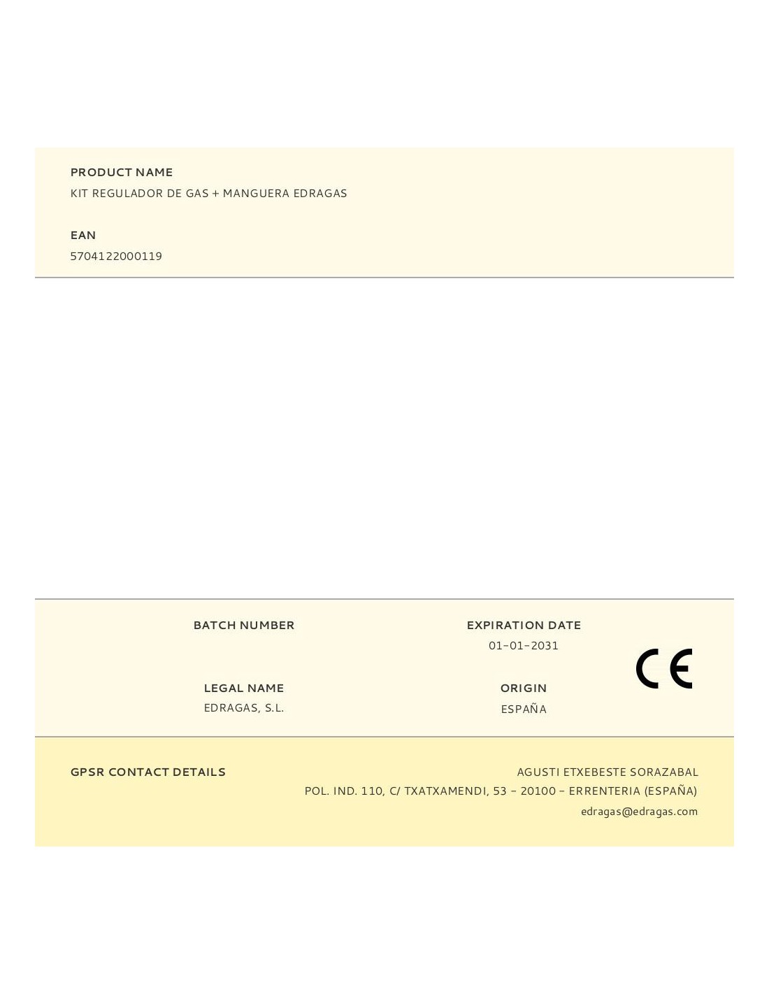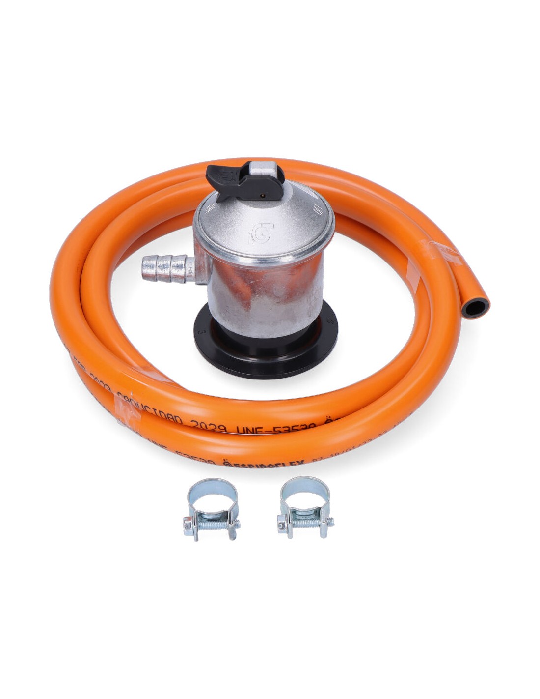 Kit regulador de gas + manguera edragas. regulador domestico ref 74188 + 1,5m de manguera + 2 abrazaderas, presentados en una bolsa con solapa de carton