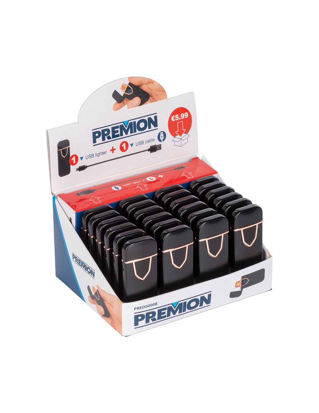 Encendedor electrónico sin llama, usb encendedor electrónico con indicador de batería. contiene cable de carga usb. color: negro. expositor de 24 unidades.
